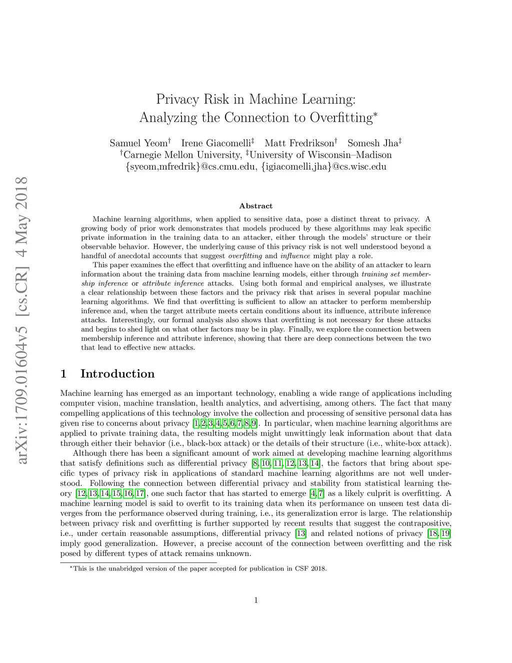Machine learning algorithms, when applied to sensitive data, pose a distinct threat to privacy. A growing body of prior work demonstrates that models produced by these algorithms may leak specific private information in the training data to an attacker, either through the models' structure or their observable behavior. However, the underlying cause of this privacy risk is not well understood beyond a handful of anecdotal accounts that suggest overfitting and influence might play a role. This paper examines the effect that overfitting and influence have on the ability of an attacker to learn information about the training data from machine learning models, either through training set membership inference or attribute inference attacks. Using both formal and empirical analyses, we illustrate a clear relationship between these factors and the privacy risk that arises in several popular machine learning algorithms. We find that overfitting is sufficient to allow an attacker to perform membership inference and, when the target attribute meets certain conditions about its influence, attribute inference attacks. Interestingly, our formal analysis also shows that overfitting is not necessary for these attacks and begins to shed light on what other factors may be in play. Finally, we explore the connection between membership inference and attribute inference, showing that there are deep connections between the two that lead to effective new attacks.