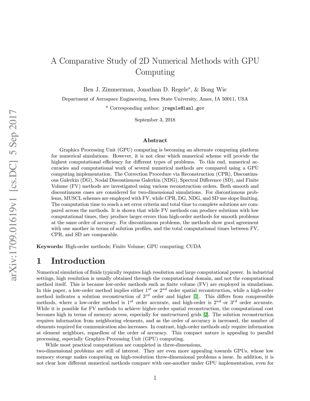 Graphics Processing Unit (GPU) computing is becoming an alternate computing platform for numerical simulations. However, it is not clear which numerical scheme will provide the highest computational efficiency for different types of problems. To this end, numerical accuracies and computational work of several numerical methods are compared using a GPU computing implementation. The Correction Procedure via Reconstruction (CPR), Discontinuous Galerkin (DG), Nodal Discontinuous Galerkin (NDG), Spectral Difference (SD), and Finite Volume (FV) methods are investigated using various reconstruction orders. Both smooth and discontinuous cases are considered for two-dimensional simulations. For discontinuous problems, MUSCL schemes are employed with FV, while CPR, DG, NDG, and SD use slope limiting. The computation time to reach a set error criteria and total time to complete solutions are compared across the methods. It is shown that while FV methods can produce solutions with low computational times, they produce larger errors than high-order methods for smooth problems at the same order of accuracy. For discontinuous problems, the methods show good agreement with one another in terms of solution profiles, and the total computational times between FV, CPR, and SD are comparable.