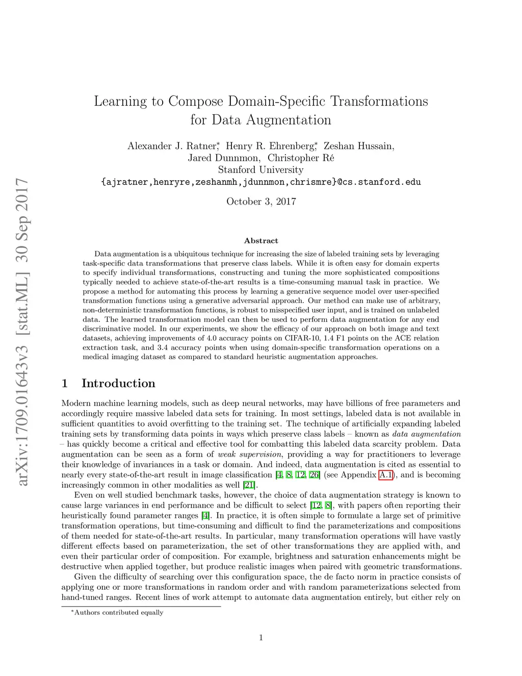 Data augmentation is a ubiquitous technique for increasing the size of labeled training sets by leveraging task-specific data transformations that preserve class labels. While it is often easy for domain experts to specify individual transformations, constructing and tuning the more sophisticated compositions typically needed to achieve state-of-the-art results is a time-consuming manual task in practice. We propose a method for automating this process by learning a generative sequence model over user-specified transformation functions using a generative adversarial approach. Our method can make use of arbitrary, non-deterministic transformation functions, is robust to misspecified user input, and is trained on unlabeled data. The learned transformation model can then be used to perform data augmentation for any end discriminative model. In our experiments, we show the efficacy of our approach on both image and text datasets, achieving improvements of 4.0 accuracy points on CIFAR-10, 1.4 F1 points on the ACE relation extraction task, and 3.4 accuracy points when using domain-specific transformation operations on a medical imaging dataset as compared to standard heuristic augmentation approaches.