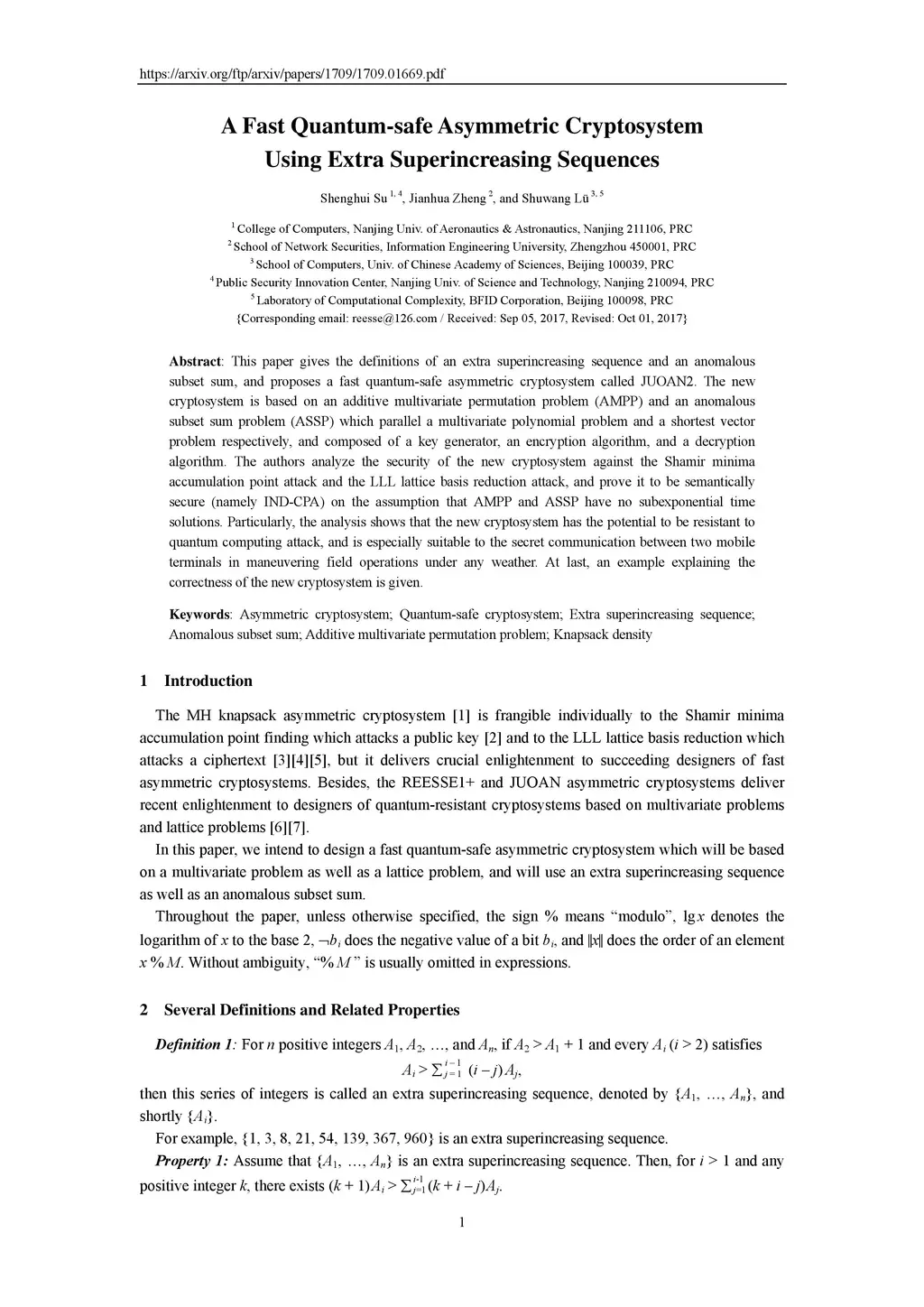 This paper gives the definitions of an extra superincreasing sequence and an anomalous subset sum, and proposes a fast quantum-safe asymmetric cryptosystem called JUOAN2. The new cryptosystem is based on an additive multivariate permutation problem (AMPP) and an anomalous subset sum problem (ASSP) which parallel a multivariate polynomial problem and a shortest vector problem respectively, and composed of a key generator, an encryption algorithm, and a decryption algorithm. The authors analyze the security of the new cryptosystem against the Shamir minima accumulation point attack and the LLL lattice basis reduction attack, and prove it to be semantically secure (namely IND-CPA) on the assumption that AMPP and ASSP have no subexponential time solutions. Particularly, the analysis shows that the new cryptosystem has the potential to be resistant to quantum computing attack, and is especially suitable to the secret communication between two mobile terminals in maneuvering field operations under any weather. At last, an example explaining the correctness of the new cryptosystem is given.
