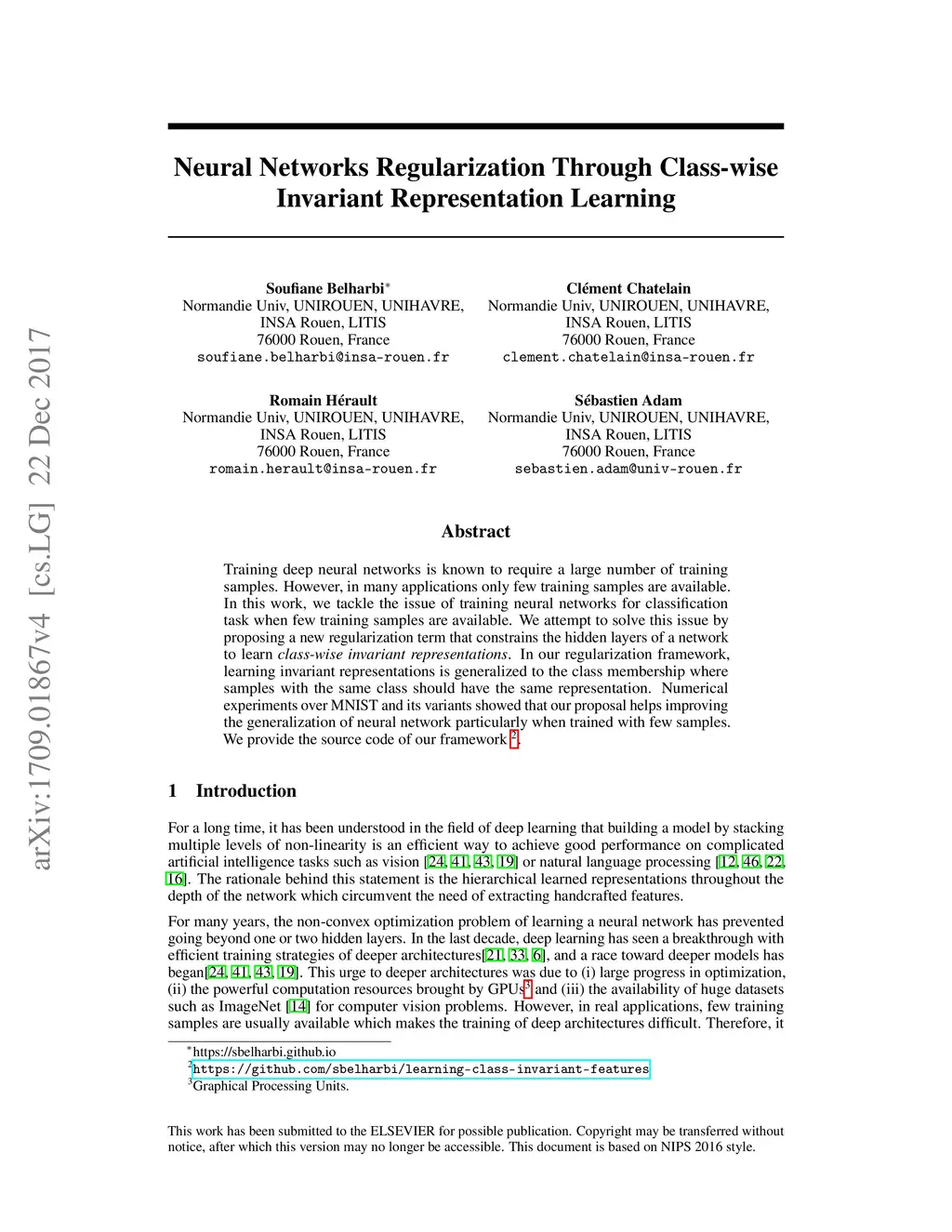 Training deep neural networks is known to require a large number of training samples. However, in many applications only few training samples are available. In this work, we tackle the issue of training neural networks for classification task when few training samples are available. We attempt to solve this issue by proposing a new regularization term that constrains the hidden layers of a network to learn class-wise invariant representations. In our regularization framework, learning invariant representations is generalized to the class membership where samples with the same class should have the same representation. Numerical experiments over MNIST and its variants showed that our proposal helps improving the generalization of neural network particularly when trained with few samples. We provide the source code of our framework https://github.com/sbelharbi/learning-class-invariant-features .