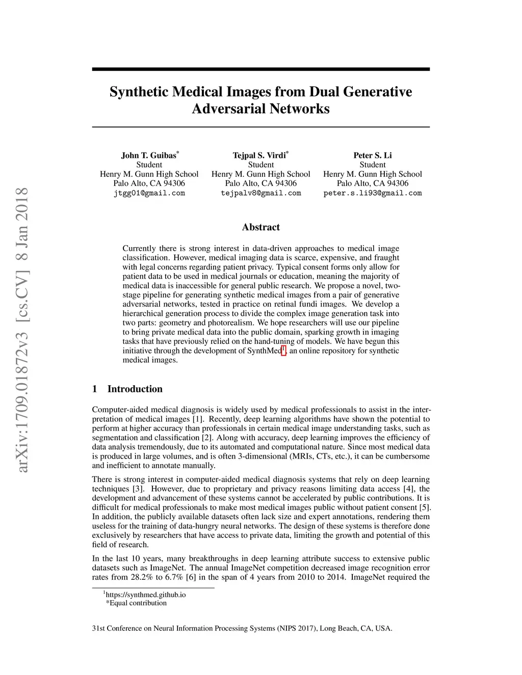 Currently there is strong interest in data-driven approaches to medical image classification. However, medical imaging data is scarce, expensive, and fraught with legal concerns regarding patient privacy. Typical consent forms only allow for patient data to be used in medical journals or education, meaning the majority of medical data is inaccessible for general public research. We propose a novel, two-stage pipeline for generating synthetic medical images from a pair of generative adversarial networks, tested in practice on retinal fundi images. We develop a hierarchical generation process to divide the complex image generation task into two parts: geometry and photorealism. We hope researchers will use our pipeline to bring private medical data into the public domain, sparking growth in imaging tasks that have previously relied on the hand-tuning of models. We have begun this initiative through the development of SynthMed, an online repository for synthetic medical images.