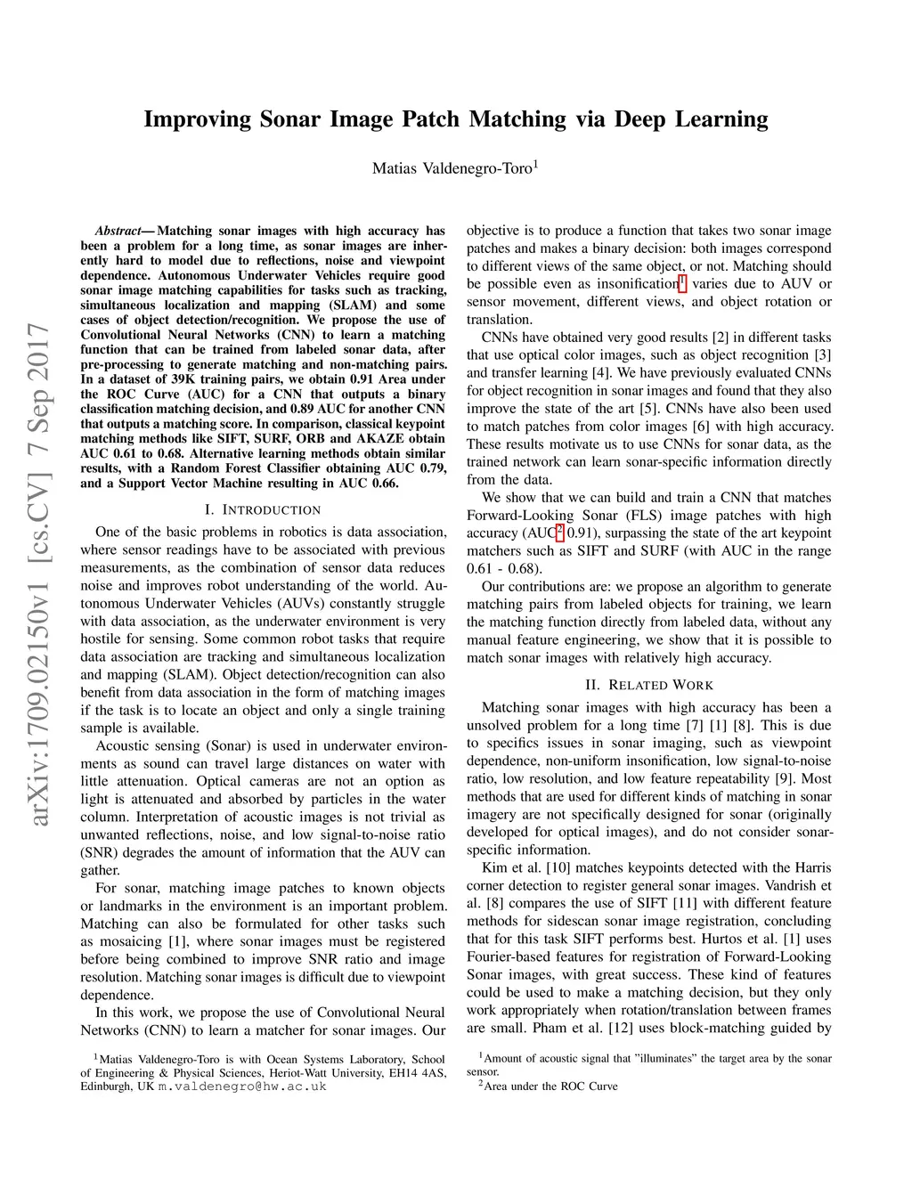 Matching sonar images with high accuracy has been a problem for a long time, as sonar images are inherently hard to model due to reflections, noise and viewpoint dependence. Autonomous Underwater Vehicles require good sonar image matching capabilities for tasks such as tracking, simultaneous localization and mapping (SLAM) and some cases of object detection/recognition. We propose the use of Convolutional Neural Networks (CNN) to learn a matching function that can be trained from labeled sonar data, after pre-processing to generate matching and non-matching pairs. In a dataset of 39K training pairs, we obtain 0.91 Area under the ROC Curve (AUC) for a CNN that outputs a binary classification matching decision, and 0.89 AUC for another CNN that outputs a matching score. In comparison, classical keypoint matching methods like SIFT, SURF, ORB and AKAZE obtain AUC 0.61 to 0.68. Alternative learning methods obtain similar results, with a Random Forest Classifier obtaining AUC 0.79, and a Support Vector Machine resulting in AUC 0.66.