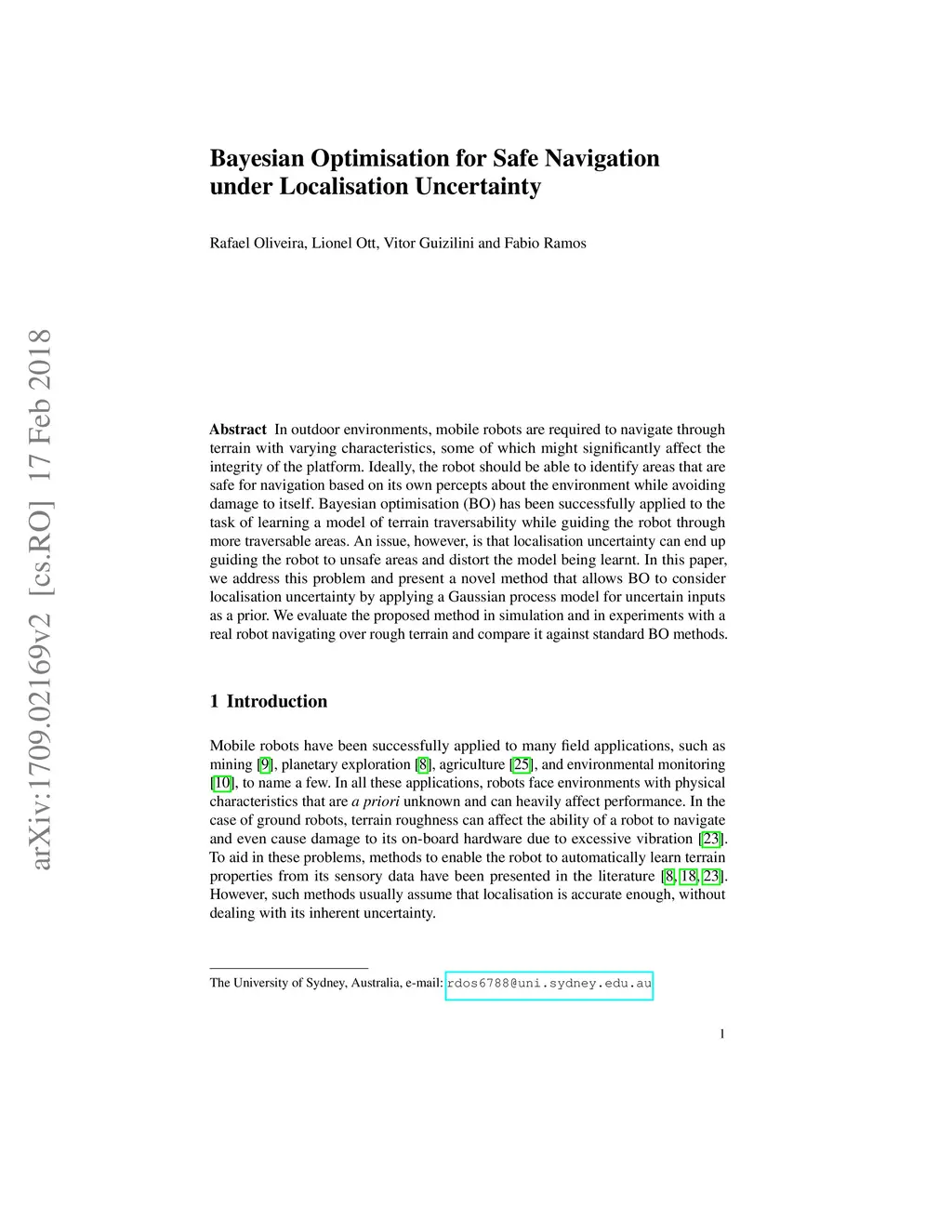 In outdoor environments, mobile robots are required to navigate through terrain with varying characteristics, some of which might significantly affect the integrity of the platform. Ideally, the robot should be able to identify areas that are safe for navigation based on its own percepts about the environment while avoiding damage to itself. Bayesian optimisation (BO) has been successfully applied to the task of learning a model of terrain traversability while guiding the robot through more traversable areas. An issue, however, is that localisation uncertainty can end up guiding the robot to unsafe areas and distort the model being learnt. In this paper, we address this problem and present a novel method that allows BO to consider localisation uncertainty by applying a Gaussian process model for uncertain inputs as a prior. We evaluate the proposed method in simulation and in experiments with a real robot navigating over rough terrain and compare it against standard BO methods.