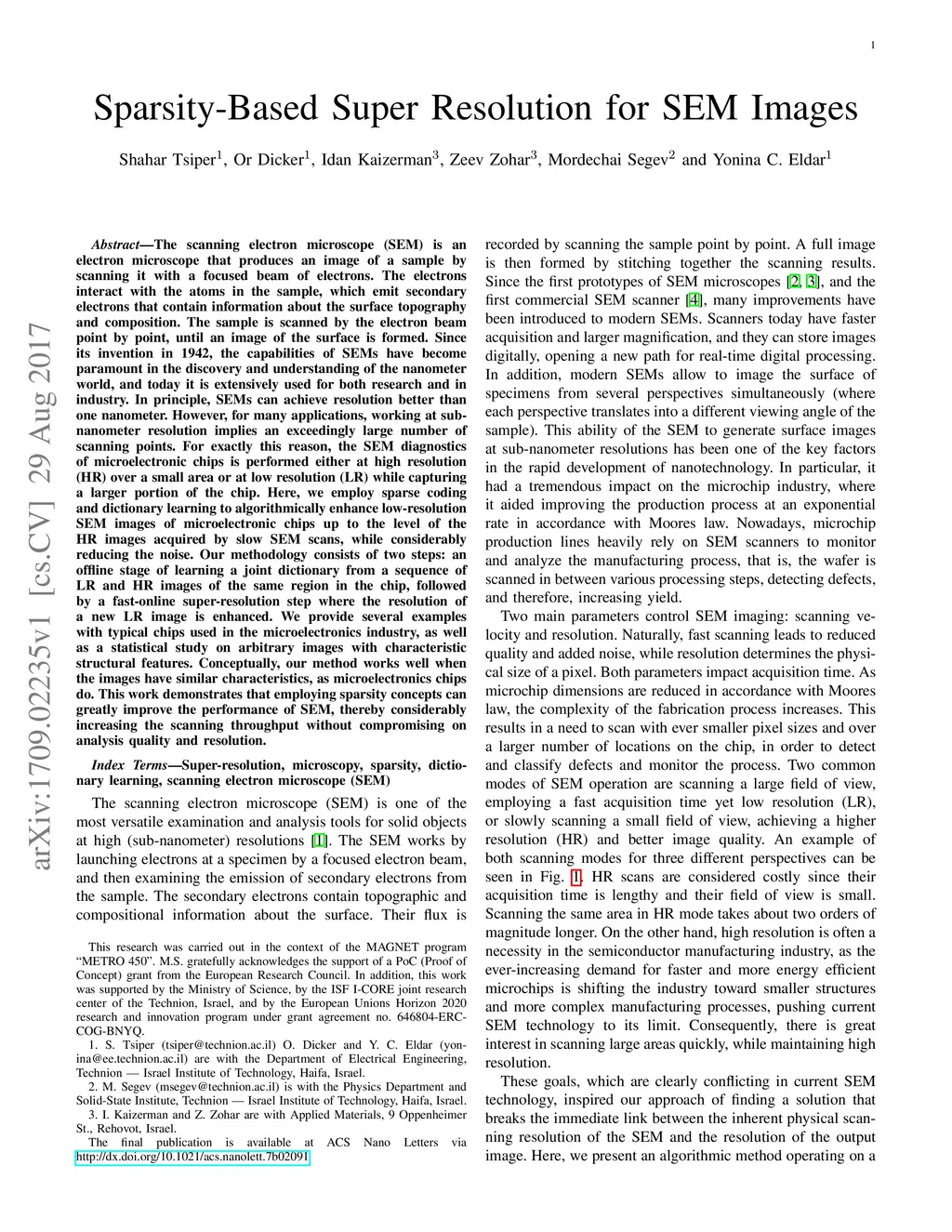 The scanning electron microscope (SEM) produces an image of a sample by scanning it with a focused beam of electrons. The electrons interact with the atoms in the sample, which emit secondary electrons that contain information about the surface topography and composition. The sample is scanned by the electron beam point by point, until an image of the surface is formed. Since its invention in 1942, SEMs have become paramount in the discovery and understanding of the nanometer world, and today it is extensively used for both research and in industry. In principle, SEMs can achieve resolution better than one nanometer. However, for many applications, working at sub-nanometer resolution implies an exceedingly large number of scanning points. For exactly this reason, the SEM diagnostics of microelectronic chips is performed either at high resolution (HR) over a small area or at low resolution (LR) while capturing a larger portion of the chip. Here, we employ sparse coding and dictionary learning to algorithmically enhance LR SEM images of microelectronic chips up to the level of the HR images acquired by slow SEM scans, while considerably reducing the noise. Our methodology consists of two steps: an offline stage of learning a joint dictionary from a sequence of LR and HR images of the same region in the chip, followed by a fast-online super-resolution step where the resolution of a new LR image is enhanced. We provide several examples with typical chips used in the microelectronics industry, as well as a statistical study on arbitrary images with characteristic structural features. Conceptually, our method works well when the images have similar characteristics. This work demonstrates that employing sparsity concepts can greatly improve the performance of SEM, thereby considerably increasing the scanning throughput without compromising on analysis quality and resolution.