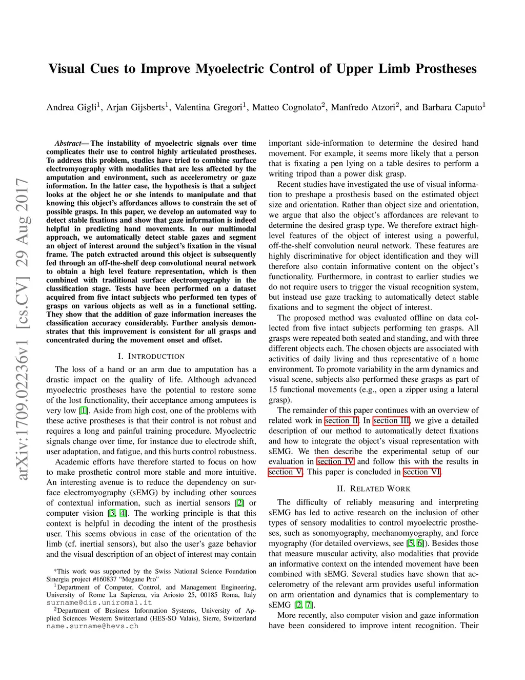The instability of myoelectric signals over time complicates their use to control highly articulated prostheses. To address this problem, studies have tried to combine surface electromyography with modalities that are less affected by the amputation and environment, such as accelerometry or gaze information. In the latter case, the hypothesis is that a subject looks at the object he or she intends to manipulate and that knowing this object's affordances allows to constrain the set of possible grasps. In this paper, we develop an automated way to detect stable fixations and show that gaze information is indeed helpful in predicting hand movements. In our multimodal approach, we automatically detect stable gazes and segment an object of interest around the subject's fixation in the visual frame. The patch extracted around this object is subsequently fed through an off-the-shelf deep convolutional neural network to obtain a high level feature representation, which is then combined with traditional surface electromyography in the classification stage. Tests have been performed on a dataset acquired from five intact subjects who performed ten types of grasps on various objects as well as in a functional setting. They show that the addition of gaze information increases the classification accuracy considerably. Further analysis demonstrates that this improvement is consistent for all grasps and concentrated during the movement onset and offset.