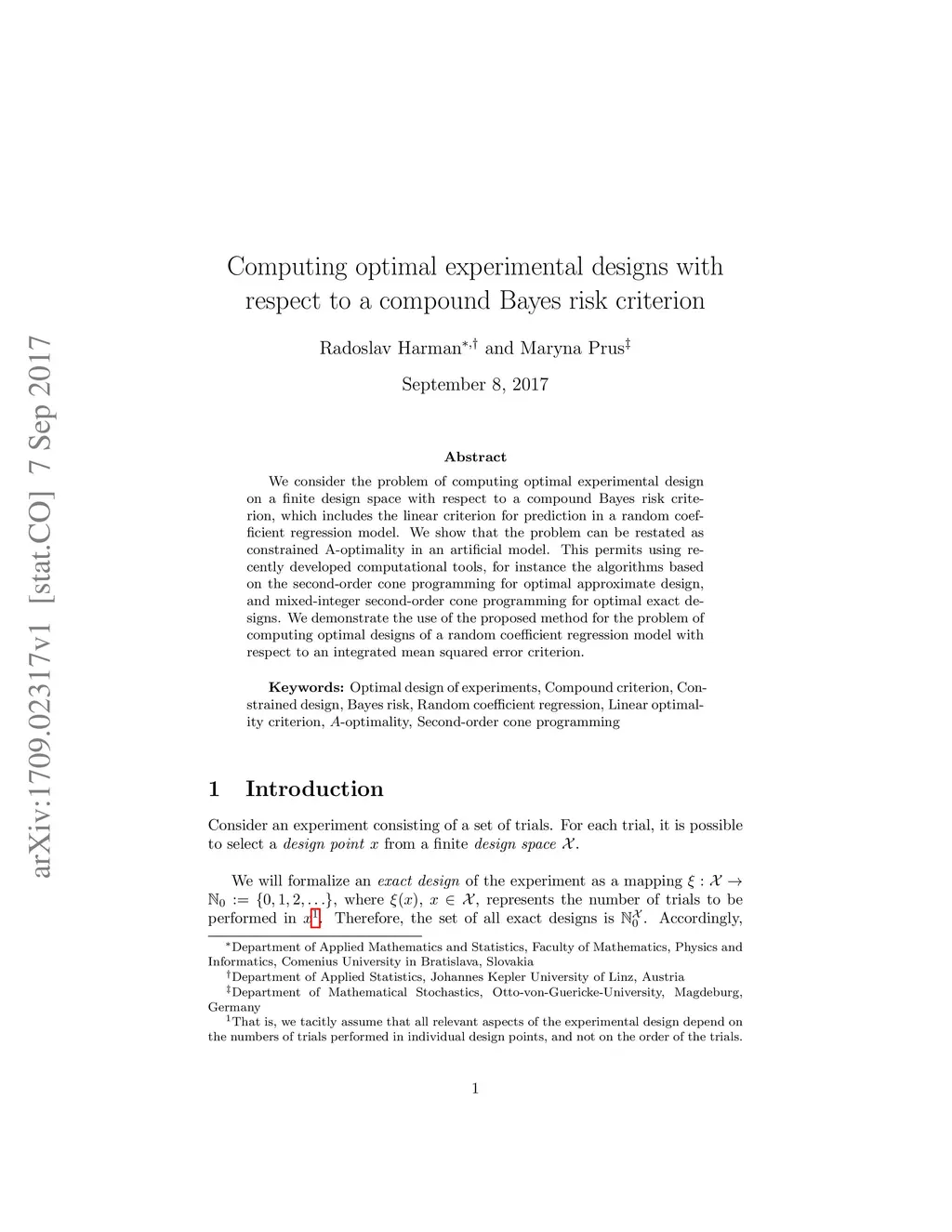 We consider the problem of computing optimal experimental design on a finite design space with respect to a compound Bayes risk criterion, which includes the linear criterion for prediction in a random coefficient regression model. We show that the problem can be restated as constrained A-optimality in an artificial model. This permits using recently developed computational tools, for instance the algorithms based on the second-order cone programming for optimal approximate design, and mixed-integer second-order cone programming for optimal exact designs. We demonstrate the use of the proposed method for the problem of computing optimal designs of a random coefficient regression model with respect to an integrated mean squared error criterion.