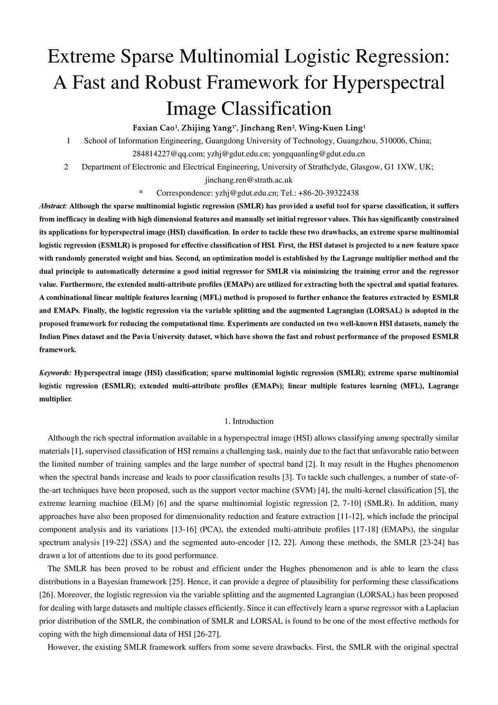 Although the sparse multinomial logistic regression (SMLR) has provided a useful tool for sparse classification, it suffers from inefficacy in dealing with high dimensional features and manually set initial regressor values. This has significantly constrained its applications for hyperspectral image (HSI) classification. In order to tackle these two drawbacks, an extreme sparse multinomial logistic regression (ESMLR) is proposed for effective classification of HSI. First, the HSI dataset is projected to a new feature space with randomly generated weight and bias. Second, an optimization model is established by the Lagrange multiplier method and the dual principle to automatically determine a good initial regressor for SMLR via minimizing the training error and the regressor value. Furthermore, the extended multi-attribute profiles (EMAPs) are utilized for extracting both the spectral and spatial features. A combinational linear multiple features learning (MFL) method is proposed to further enhance the features extracted by ESMLR and EMAPs. Finally, the logistic regression via the variable splitting and the augmented Lagrangian (LORSAL) is adopted in the proposed framework for reducing the computational time. Experiments are conducted on two well-known HSI datasets, namely the Indian Pines dataset and the Pavia University dataset, which have shown the fast and robust performance of the proposed ESMLR framework.