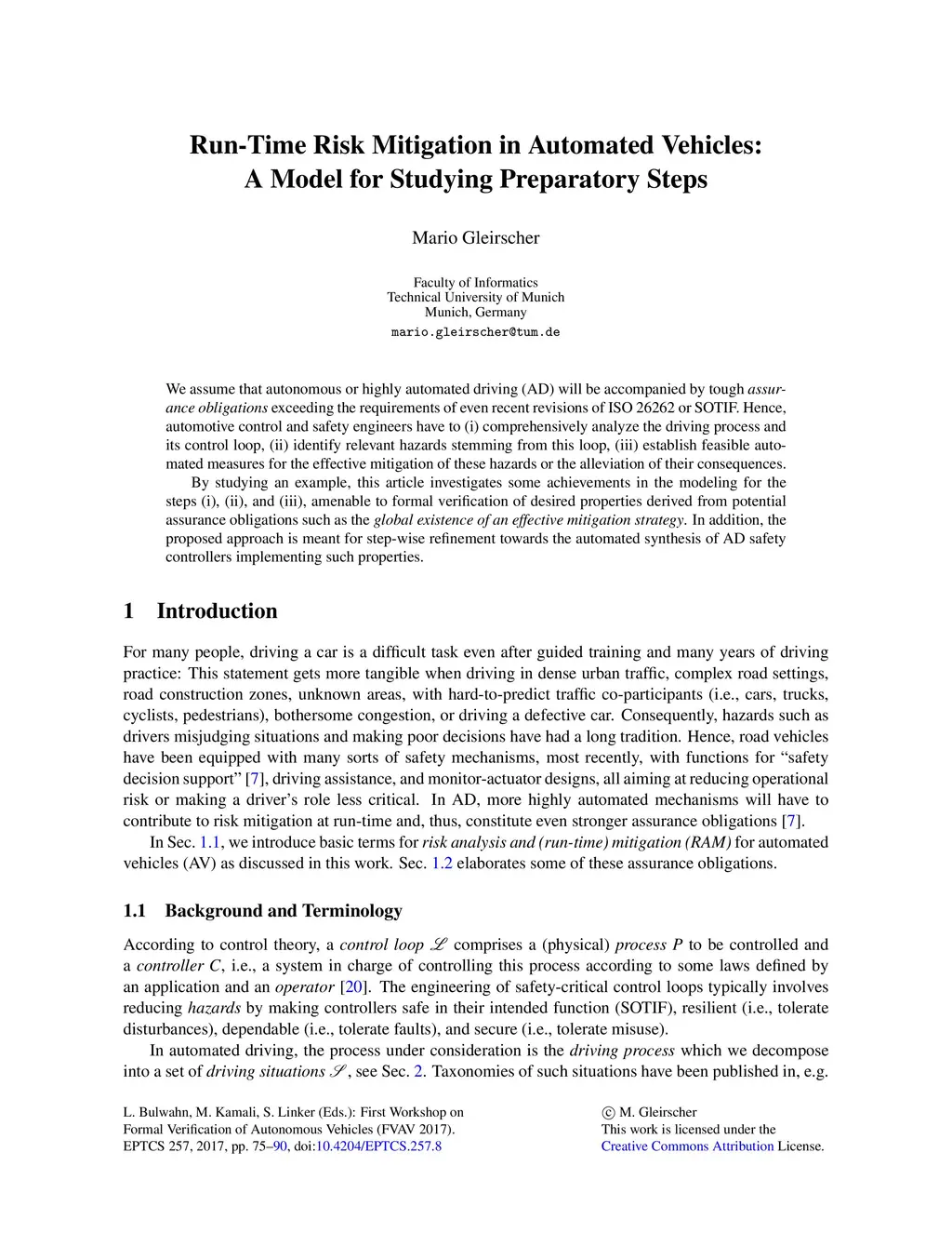 Run-Time Risk Mitigation in Automated Vehicles: A Model for Studying