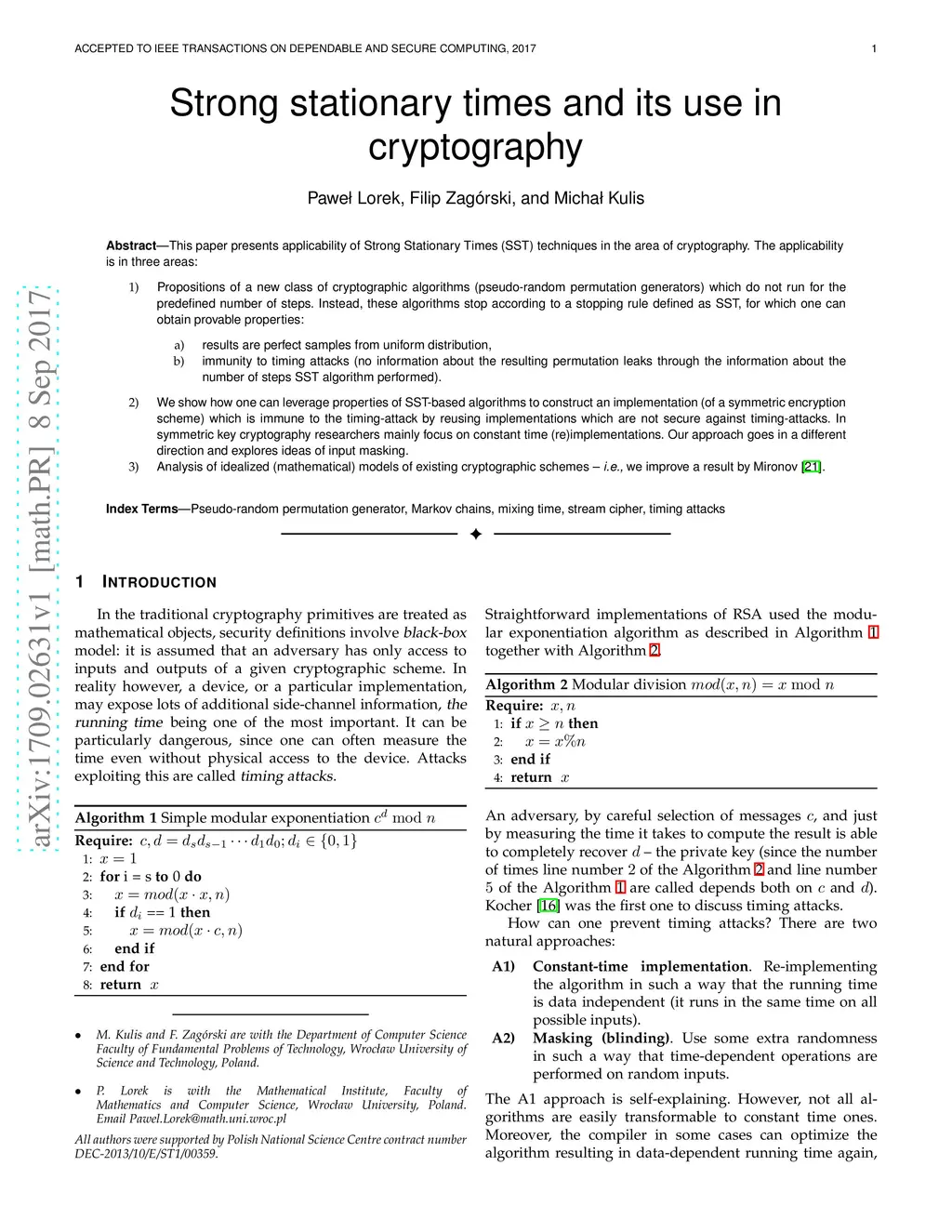 This paper presents applicability of Strong Stationary Times (SST) techniques in the area of cryptography. The applicability is in three areas: *) Propositions of a new class of cryptographic algorithms (pseudo-random permutation generators) which do not run for the predefined number of steps. Instead, these algorithms stop according to a stopping rule defined as SST, for which one can obtain provable properties: *** results are perfect samples from uniform distribution, *** immunity to timing attacks (no information about the resulting permutation leaks through the information about the number of steps SST algorithm *) We show how one can leverage properties of SST-based algorithms to construct an implementation (of a symmetric encryption scheme) which is immune to the timing-attack by reusing implementations which are not secure against timing-attacks. In symmetric key cryptography researchers mainly focus on constant time (re)implementations. Our approach goes in a different direction and explores ideas of input masking. *) Analysis of idealized (mathematical) models of existing cryptographic schemes -- i.e., we improve a result by Mironov ((Not So) Random Shuffles of RC4; Advances in Cryptology -- CRYPTO 2002)