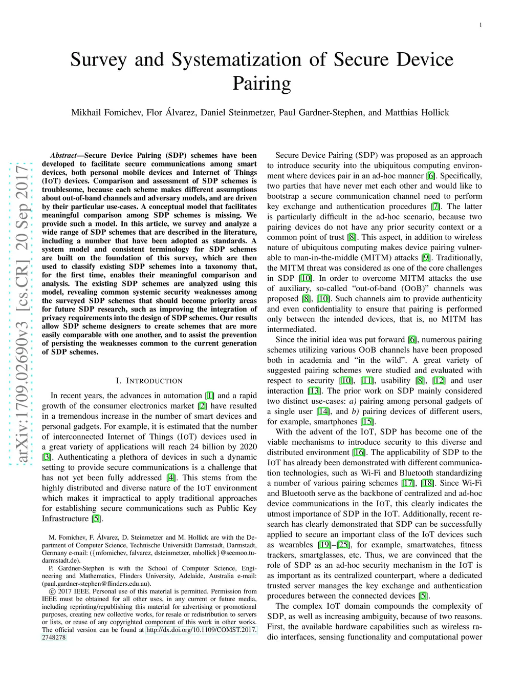Secure Device Pairing (SDP) schemes have been developed to facilitate secure communications among smart devices, both personal mobile devices and Internet of Things (IoT) devices. Comparison and assessment of SDP schemes is troublesome, because each scheme makes different assumptions about out-of-band channels and adversary models, and are driven by their particular use-cases. A conceptual model that facilitates meaningful comparison among SDP schemes is missing. We provide such a model. In this article, we survey and analyze a wide range of SDP schemes that are described in the literature, including a number that have been adopted as standards. A system model and consistent terminology for SDP schemes are built on the foundation of this survey, which are then used to classify existing SDP schemes into a taxonomy that, for the first time, enables their meaningful comparison and analysis.The existing SDP schemes are analyzed using this model, revealing common systemic security weaknesses among the surveyed SDP schemes that should become priority areas for future SDP research, such as improving the integration of privacy requirements into the design of SDP schemes. Our results allow SDP scheme designers to create schemes that are more easily comparable with one another, and to assist the prevention of persisting the weaknesses common to the current generation of SDP schemes.