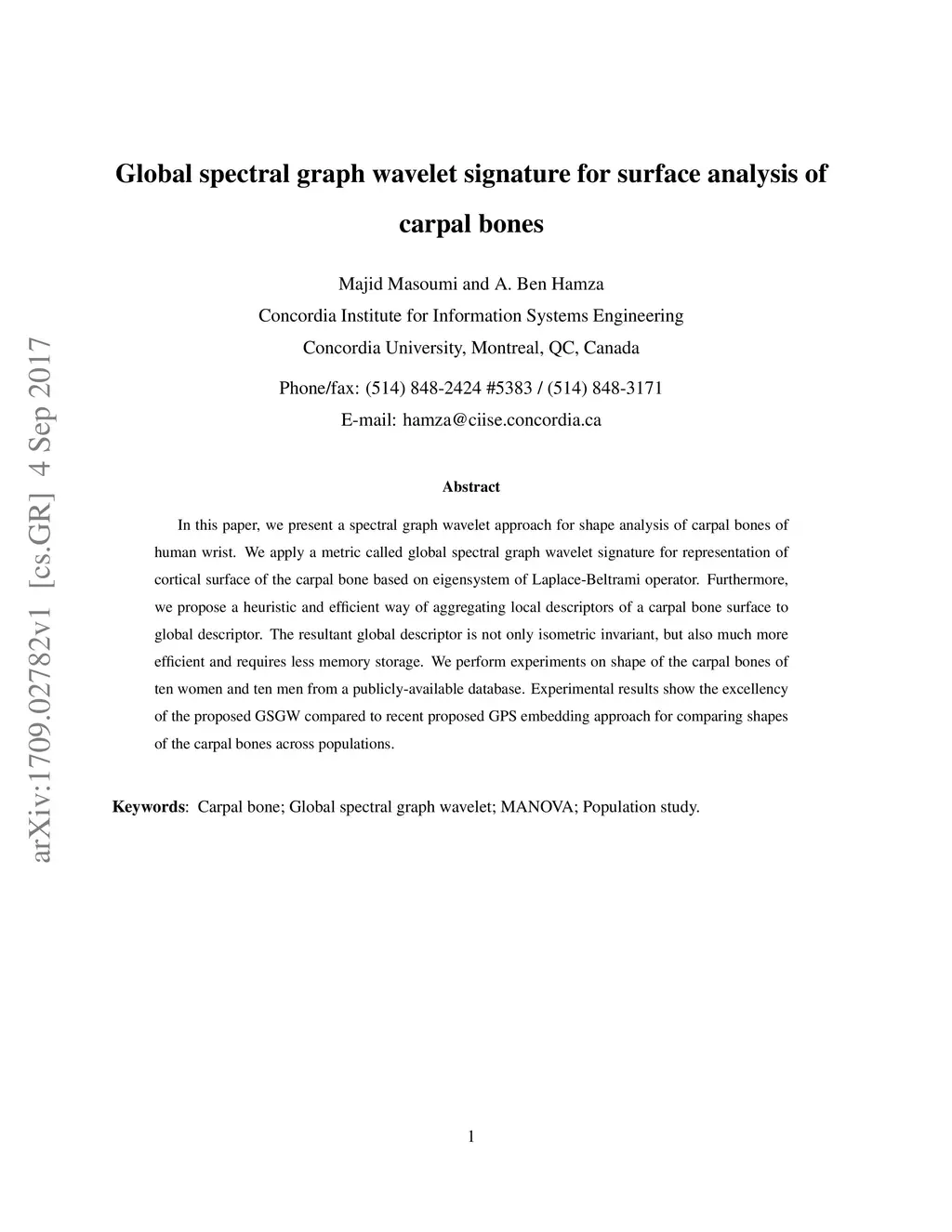 In this paper, we present a spectral graph wavelet approach for shape analysis of carpal bones of human wrist. We apply a metric called global spectral graph wavelet signature for representation of cortical surface of the carpal bone based on eigensystem of Laplace-Beltrami operator. Furthermore, we propose a heuristic and efficient way of aggregating local descriptors of a carpal bone surface to global descriptor. The resultant global descriptor is not only isometric invariant, but also much more efficient and requires less memory storage. We perform experiments on shape of the carpal bones of ten women and ten men from a publicly-available database. Experimental results show the excellency of the proposed GSGW compared to recent proposed GPS embedding approach for comparing shapes of the carpal bones across populations.