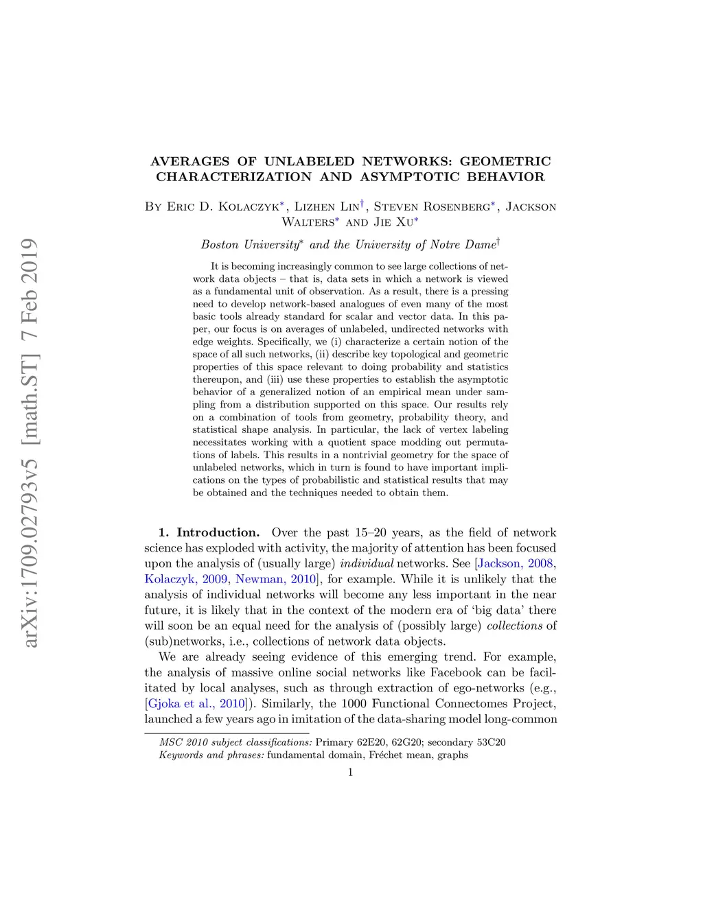 It is becoming increasingly common to see large collections of network data objects -- that is, data sets in which a network is viewed as a fundamental unit of observation. As a result, there is a pressing need to develop network-based analogues of even many of the most basic tools already standard for scalar and vector data. In this paper, our focus is on averages of unlabeled, undirected networks with edge weights. Specifically, we (i) characterize a certain notion of the space of all such networks, (ii) describe key topological and geometric properties of this space relevant to doing probability and statistics thereupon, and (iii) use these properties to establish the asymptotic behavior of a generalized notion of an empirical mean under sampling from a distribution supported on this space. Our results rely on a combination of tools from geometry, probability theory, and statistical shape analysis. In particular, the lack of vertex labeling necessitates working with a quotient space modding out permutations of labels. This results in a nontrivial geometry for the space of unlabeled networks, which in turn is found to have important implications on the types of probabilistic and statistical results that may be obtained and the techniques needed to obtain them. This version contains two extensions of the main result on the uniqueness of the Fr\'echet mean, and has added references to related work.