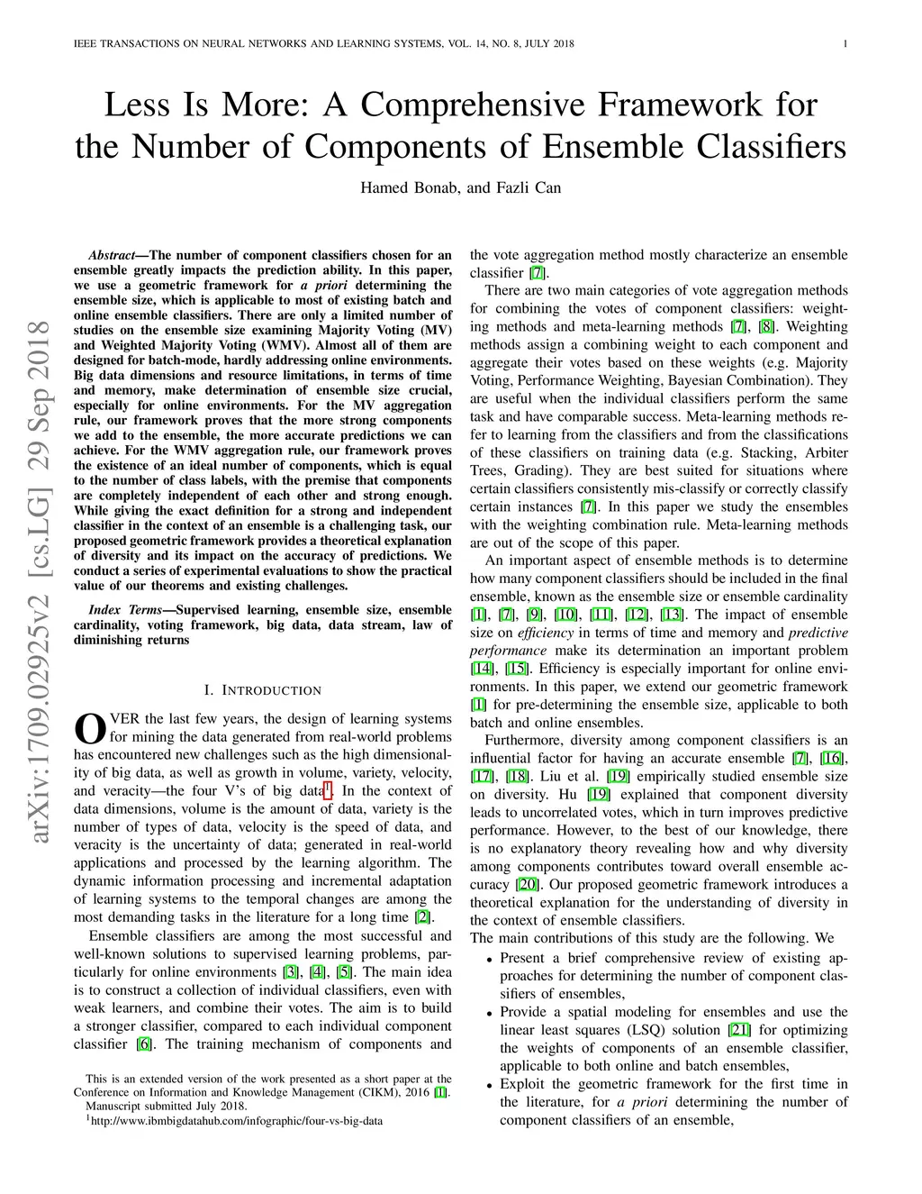The number of component classifiers chosen for an ensemble greatly impacts the prediction ability. In this paper, we use a geometric framework for a priori determining the ensemble size, which is applicable to most of existing batch and online ensemble classifiers. There are only a limited number of studies on the ensemble size examining Majority Voting (MV) and Weighted Majority Voting (WMV). Almost all of them are designed for batch-mode, hardly addressing online environments. Big data dimensions and resource limitations, in terms of time and memory, make determination of ensemble size crucial, especially for online environments. For the MV aggregation rule, our framework proves that the more strong components we add to the ensemble, the more accurate predictions we can achieve. For the WMV aggregation rule, our framework proves the existence of an ideal number of components, which is equal to the number of class labels, with the premise that components are completely independent of each other and strong enough. While giving the exact definition for a strong and independent classifier in the context of an ensemble is a challenging task, our proposed geometric framework provides a theoretical explanation of diversity and its impact on the accuracy of predictions. We conduct a series of experimental evaluations to show the practical value of our theorems and existing challenges.