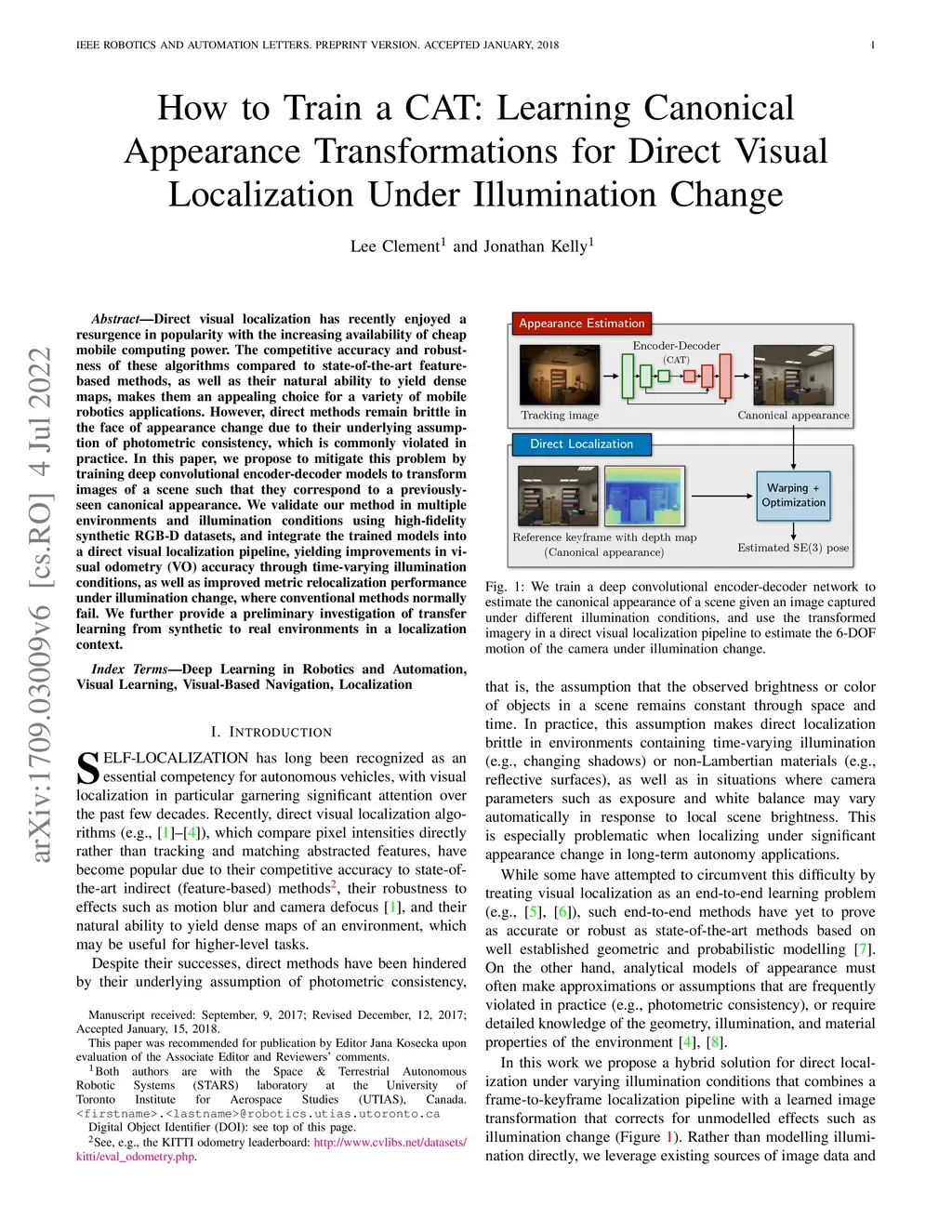 Direct visual localization has recently enjoyed a resurgence in popularity with the increasing availability of cheap mobile computing power. The competitive accuracy and robustness of these algorithms compared to state-of-the-art feature-based methods, as well as their natural ability to yield dense maps, makes them an appealing choice for a variety of mobile robotics applications. However, direct methods remain brittle in the face of appearance change due to their underlying assumption of photometric consistency, which is commonly violated in practice. In this paper, we propose to mitigate this problem by training deep convolutional encoder-decoder models to transform images of a scene such that they correspond to a previously-seen canonical appearance. We validate our method in multiple environments and illumination conditions using high-fidelity synthetic RGB-D datasets, and integrate the trained models into a direct visual localization pipeline, yielding improvements in visual odometry (VO) accuracy through time-varying illumination conditions, as well as improved metric relocalization performance under illumination change, where conventional methods normally fail. We further provide a preliminary investigation of transfer learning from synthetic to real environments in a localization context. An open-source implementation of our method using PyTorch is available at https://github.com/utiasSTARS/cat-net.