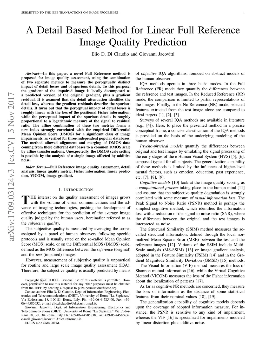 A Detail Based Method for Linear Full Reference Image Quality Prediction