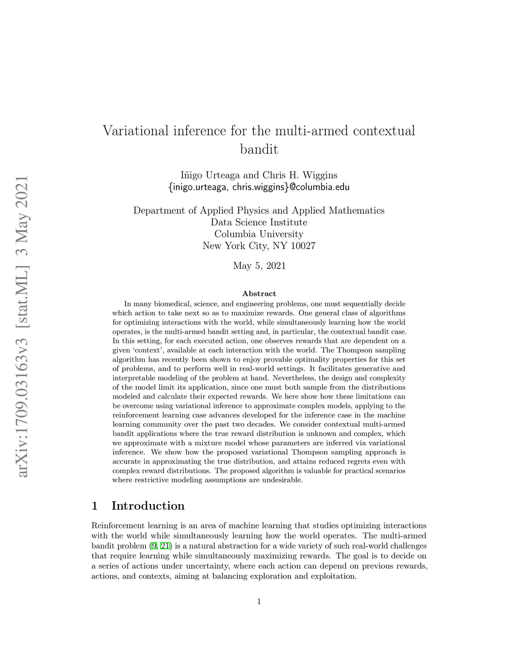 Variational inference for the multi-armed contextual bandit