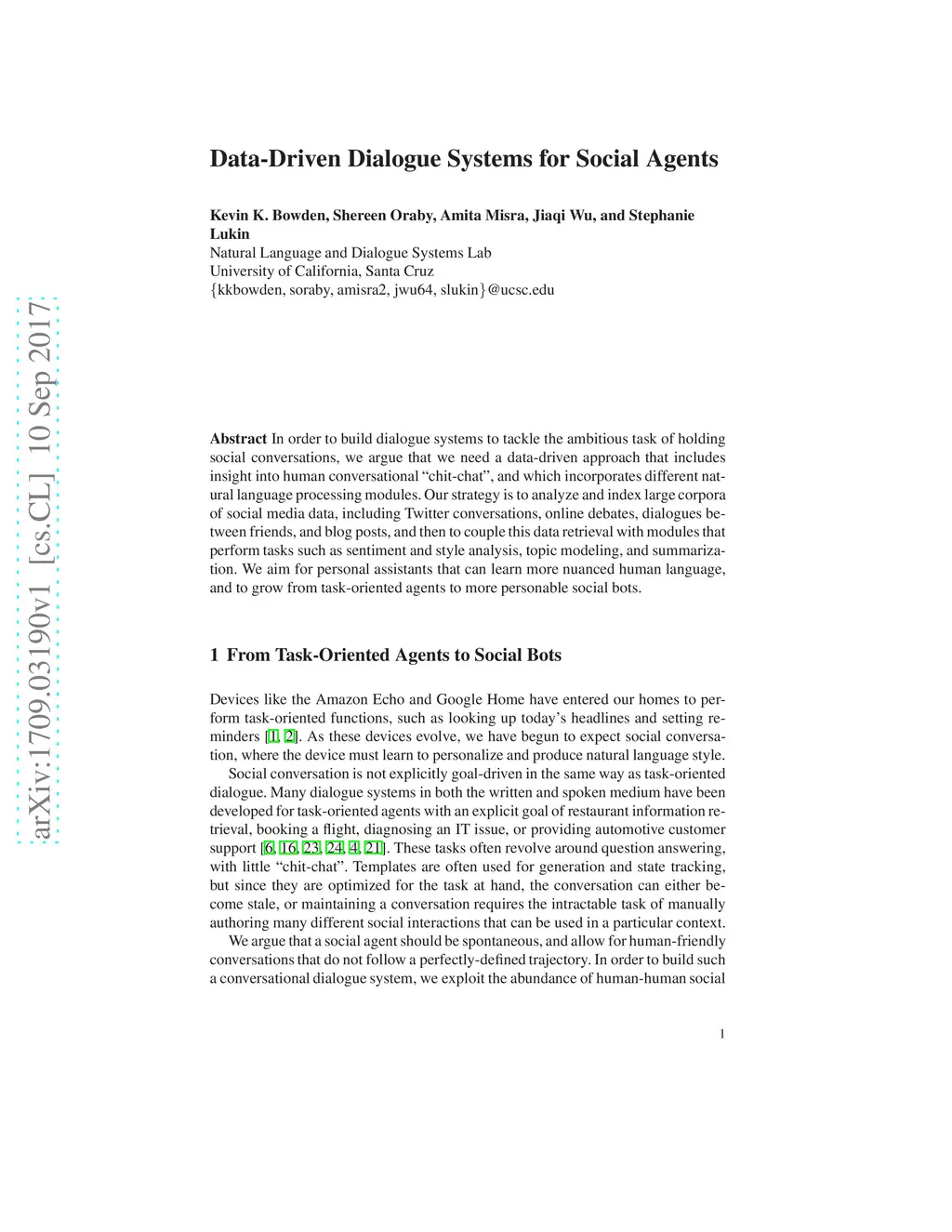In order to build dialogue systems to tackle the ambitious task of holding social conversations, we argue that we need a data driven approach that includes insight into human conversational chit chat, and which incorporates different natural language processing modules. Our strategy is to analyze and index large corpora of social media data, including Twitter conversations, online debates, dialogues between friends, and blog posts, and then to couple this data retrieval with modules that perform tasks such as sentiment and style analysis, topic modeling, and summarization. We aim for personal assistants that can learn more nuanced human language, and to grow from task-oriented agents to more personable social bots.