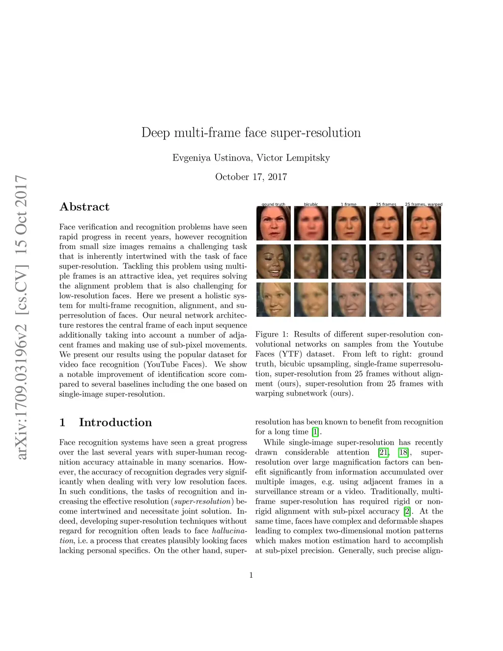 Face verification and recognition problems have seen rapid progress in recent years, however recognition from small size images remains a challenging task that is inherently intertwined with the task of face super-resolution. Tackling this problem using multiple frames is an attractive idea, yet requires solving the alignment problem that is also challenging for low-resolution faces. Here we present a holistic system for multi-frame recognition, alignment, and superresolution of faces. Our neural network architecture restores the central frame of each input sequence additionally taking into account a number of adjacent frames and making use of sub-pixel movements. We present our results using the popular dataset for video face recognition (YouTube Faces). We show a notable improvement of identification score compared to several baselines including the one based on single-image super-resolution.