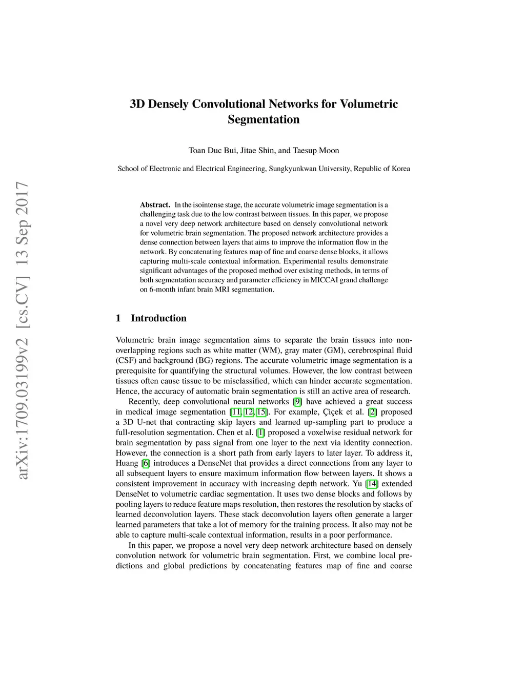 In the isointense stage, the accurate volumetric image segmentation is a challenging task due to the low contrast between tissues. In this paper, we propose a novel very deep network architecture based on a densely convolutional network for volumetric brain segmentation. The proposed network architecture provides a dense connection between layers that aims to improve the information flow in the network. By concatenating features map of fine and coarse dense blocks, it allows capturing multi-scale contextual information. Experimental results demonstrate significant advantages of the proposed method over existing methods, in terms of both segmentation accuracy and parameter efficiency in MICCAI grand challenge on 6-month infant brain MRI segmentation.