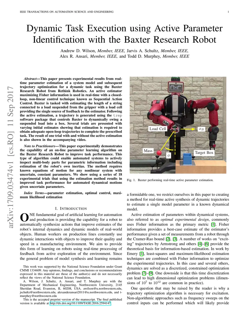 This paper presents experimental results from real-time parameter estimation of a system model and subsequent trajectory optimization for a dynamic task using the Baxter Research Robot from Rethink Robotics. An active estimator maximizing Fisher information is used in real-time with a closed-loop, non-linear control technique known as Sequential Action Control. Baxter is tasked with estimating the length of a string connected to a load suspended from the gripper with a load cell providing the single source of feedback to the estimator. Following the active estimation, a trajectory is generated using the trep software package that controls Baxter to dynamically swing a suspended load into a box. Several trials are presented with varying initial estimates showing that estimation is required to obtain adequate open-loop trajectories to complete the prescribed task. The result of one trial with and without the active estimation is also shown in the accompanying video.
