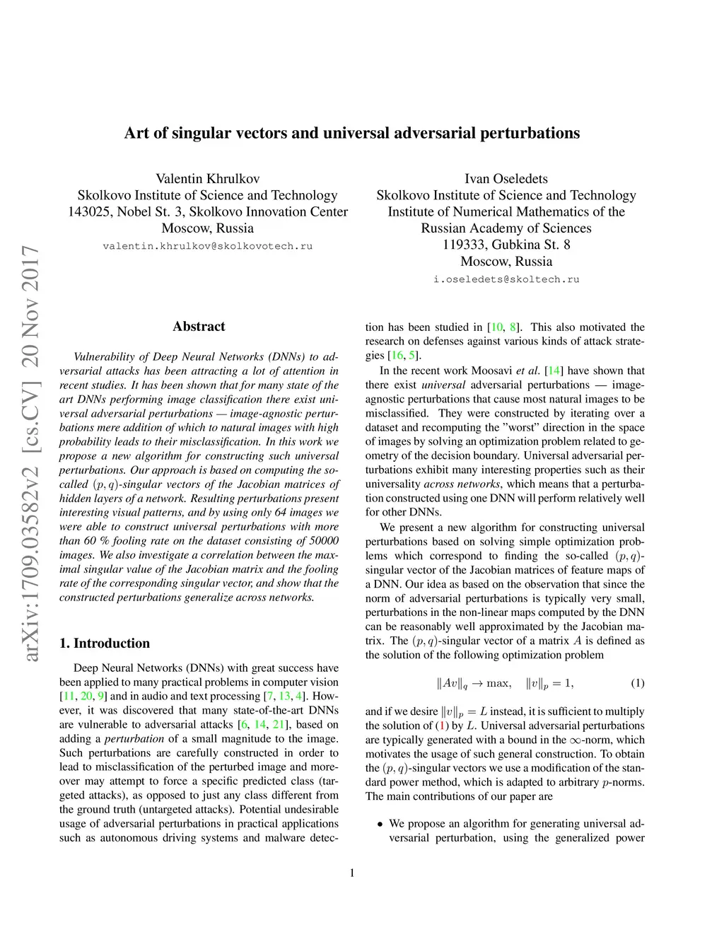Vulnerability of Deep Neural Networks (DNNs) to adversarial attacks has been attracting a lot of attention in recent studies. It has been shown that for many state of the art DNNs performing image classification there exist universal adversarial perturbations --- image-agnostic perturbations mere addition of which to natural images with high probability leads to their misclassification. In this work we propose a new algorithm for constructing such universal perturbations. Our approach is based on computing the so-called -singular vectors of the Jacobian matrices of hidden layers of a network. Resulting perturbations present interesting visual patterns, and by using only 64 images we were able to construct universal perturbations with more than 60 \% fooling rate on the dataset consisting of 50000 images. We also investigate a correlation between the maximal singular value of the Jacobian matrix and the fooling rate of the corresponding singular vector, and show that the constructed perturbations generalize across networks.