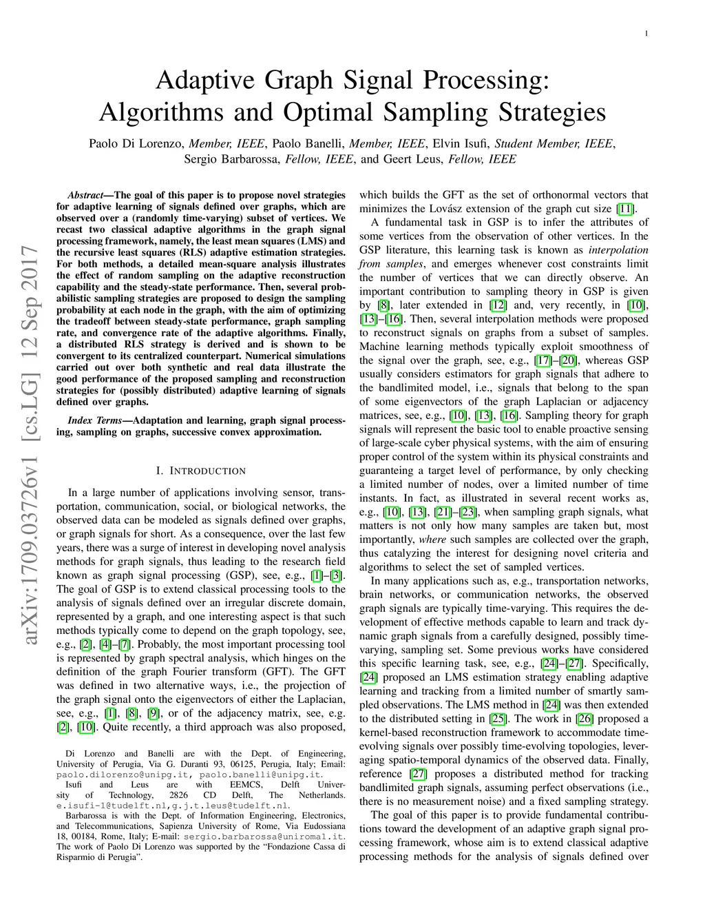 The goal of this paper is to propose novel strategies for adaptive learning of signals defined over graphs, which are observed over a (randomly time-varying) subset of vertices. We recast two classical adaptive algorithms in the graph signal processing framework, namely, the least mean squares (LMS) and the recursive least squares (RLS) adaptive estimation strategies. For both methods, a detailed mean-square analysis illustrates the effect of random sampling on the adaptive reconstruction capability and the steady-state performance. Then, several probabilistic sampling strategies are proposed to design the sampling probability at each node in the graph, with the aim of optimizing the tradeoff between steady-state performance, graph sampling rate, and convergence rate of the adaptive algorithms. Finally, a distributed RLS strategy is derived and is shown to be convergent to its centralized counterpart. Numerical simulations carried out over both synthetic and real data illustrate the good performance of the proposed sampling and reconstruction strategies for (possibly distributed) adaptive learning of signals defined over graphs.