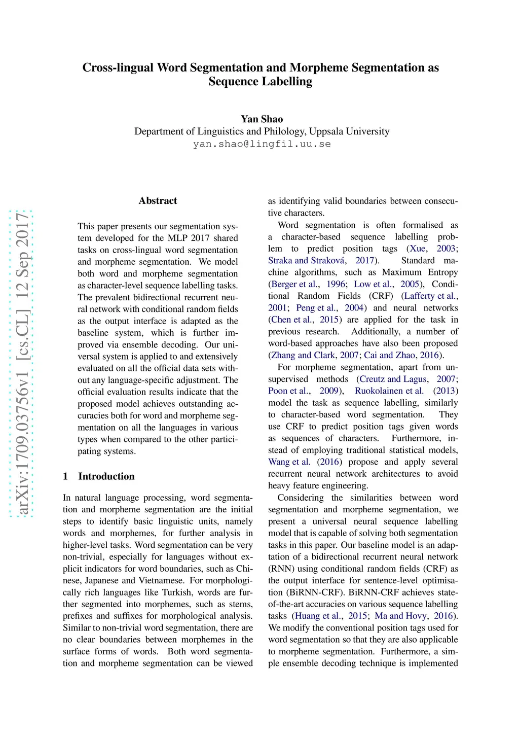 This paper presents our segmentation system developed for the MLP 2017 shared tasks on cross-lingual word segmentation and morpheme segmentation. We model both word and morpheme segmentation as character-level sequence labelling tasks. The prevalent bidirectional recurrent neural network with conditional random fields as the output interface is adapted as the baseline system, which is further improved via ensemble decoding. Our universal system is applied to and extensively evaluated on all the official data sets without any language-specific adjustment. The official evaluation results indicate that the proposed model achieves outstanding accuracies both for word and morpheme segmentation on all the languages in various types when compared to the other participating systems.