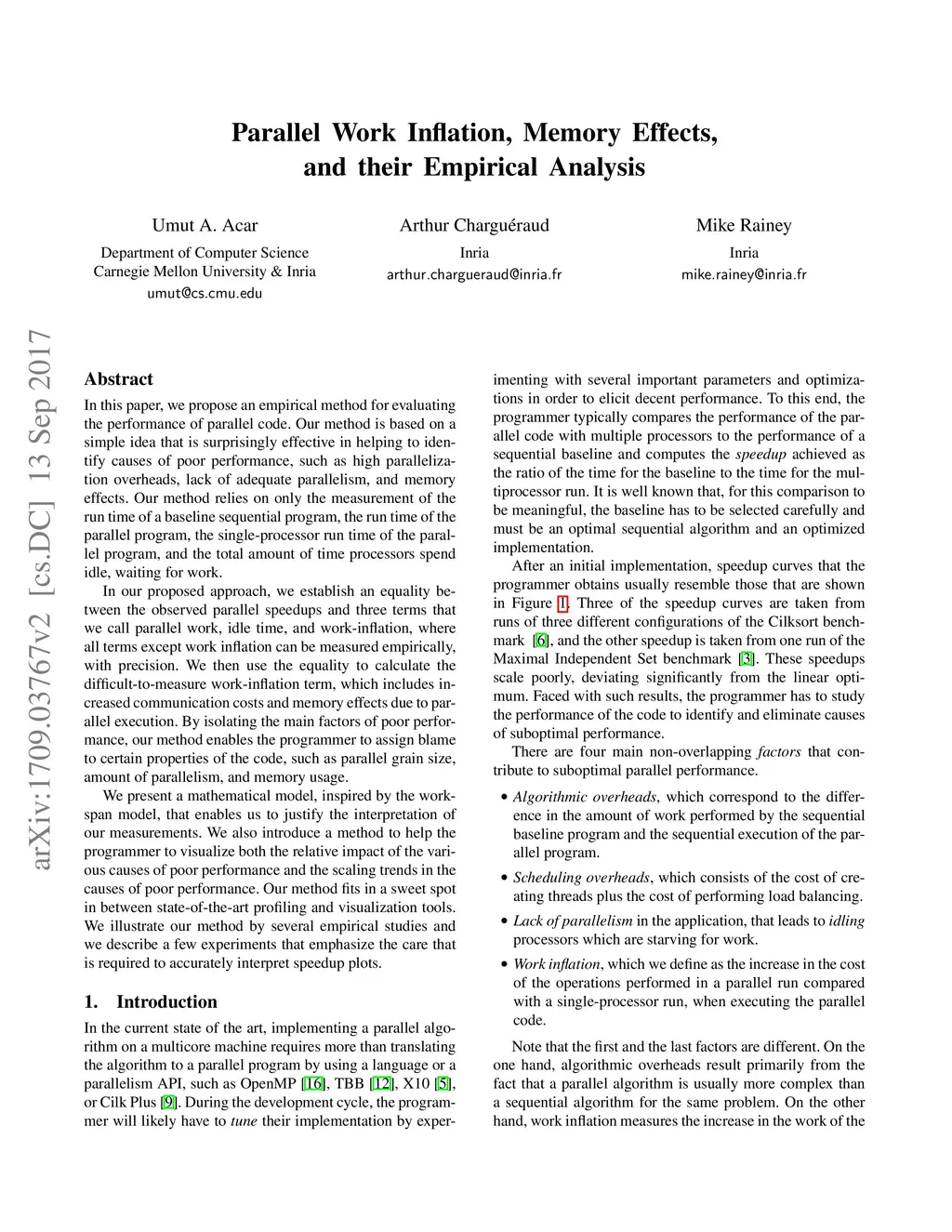 In this paper, we propose an empirical method for evaluating the performance of parallel code. Our method is based on a simple idea that is surprisingly effective in helping to identify causes of poor performance, such as high parallelization overheads, lack of adequate parallelism, and memory effects. Our method relies on only the measurement of the run time of a baseline sequential program, the run time of the parallel program, the single-processor run time of the parallel program, and the total amount of time processors spend idle, waiting for work. In our proposed approach, we establish an equality between the observed parallel speedups and three terms that we call parallel work, idle time, and work-inflation, where all terms except work inflation can be measured empirically, with precision. We then use the equality to calculate the difficult-to-measure work-inflation term, which includes increased communication costs and memory effects due to parallel execution. By isolating the main factors of poor performance, our method enables the programmer to assign blame to certain properties of the code, such as parallel grain size, amount of parallelism, and memory usage. We present a mathematical model, inspired by the work-span model, that enables us to justify the interpretation of our measurements. We also introduce a method to help the programmer to visualize both the relative impact of the various causes of poor performance and the scaling trends in the causes of poor performance. Our method fits in a sweet spot in between state-of-the-art profiling and visualization tools. We illustrate our method by several empirical studies and we describe a few experiments that emphasize the care that is required to accurately interpret speedup plots.