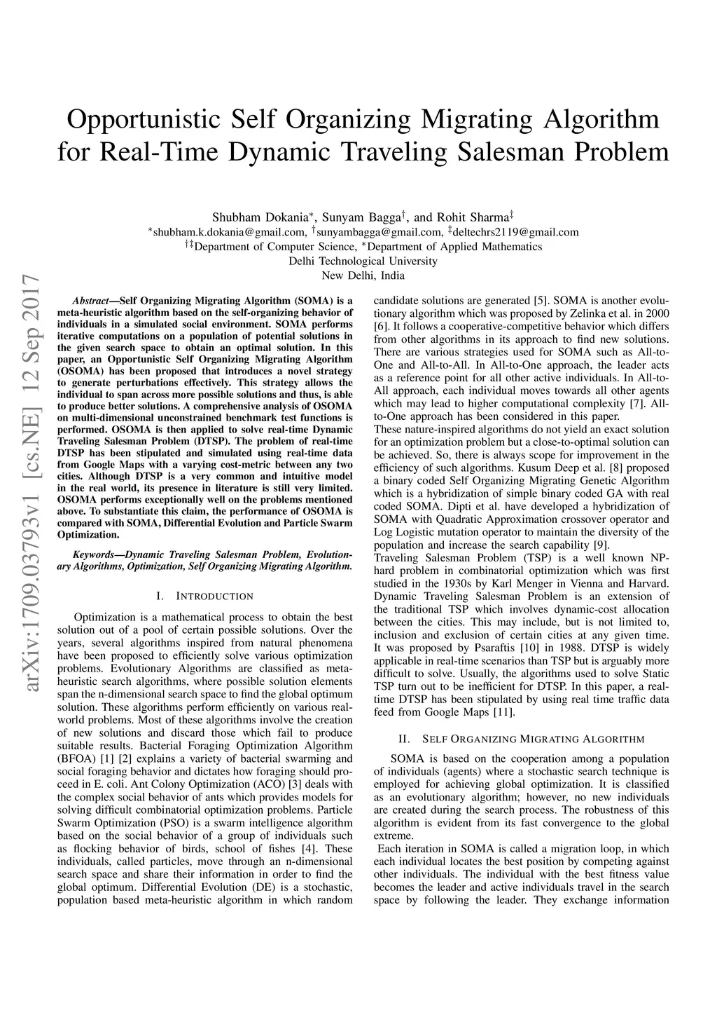 Self Organizing Migrating Algorithm (SOMA) is a meta-heuristic algorithm based on the self-organizing behavior of individuals in a simulated social environment. SOMA performs iterative computations on a population of potential solutions in the given search space to obtain an optimal solution. In this paper, an Opportunistic Self Organizing Migrating Algorithm (OSOMA) has been proposed that introduces a novel strategy to generate perturbations effectively. This strategy allows the individual to span across more possible solutions and thus, is able to produce better solutions. A comprehensive analysis of OSOMA on multi-dimensional unconstrained benchmark test functions is performed. OSOMA is then applied to solve real-time Dynamic Traveling Salesman Problem (DTSP). The problem of real-time DTSP has been stipulated and simulated using real-time data from Google Maps with a varying cost-metric between any two cities. Although DTSP is a very common and intuitive model in the real world, its presence in literature is still very limited. OSOMA performs exceptionally well on the problems mentioned above. To substantiate this claim, the performance of OSOMA is compared with SOMA, Differential Evolution and Particle Swarm Optimization.