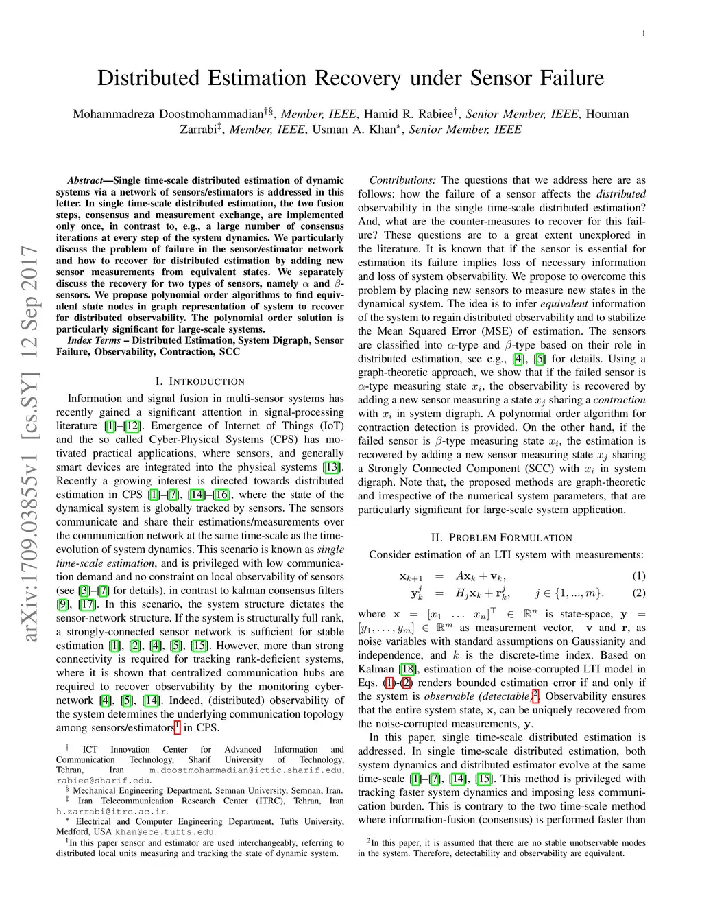 Single time-scale distributed estimation of dynamic systems via a network of sensors/estimators is addressed in this letter. In single time-scale distributed estimation, the two fusion steps, consensus and measurement exchange, are implemented only once, in contrast to, e.g., a large number of consensus iterations at every step of the system dynamics. We particularly discuss the problem of failure in the sensor/estimator network and how to recover for distributed estimation by adding new sensor measurements from equivalent states. We separately discuss the recovery for two types of sensors, namely \alpha and \beta sensors. We propose polynomial order algorithms to find equivalent state nodes in graph representation of system to recover for distributed observability. The polynomial order solution is particularly significant for large-scale systems.