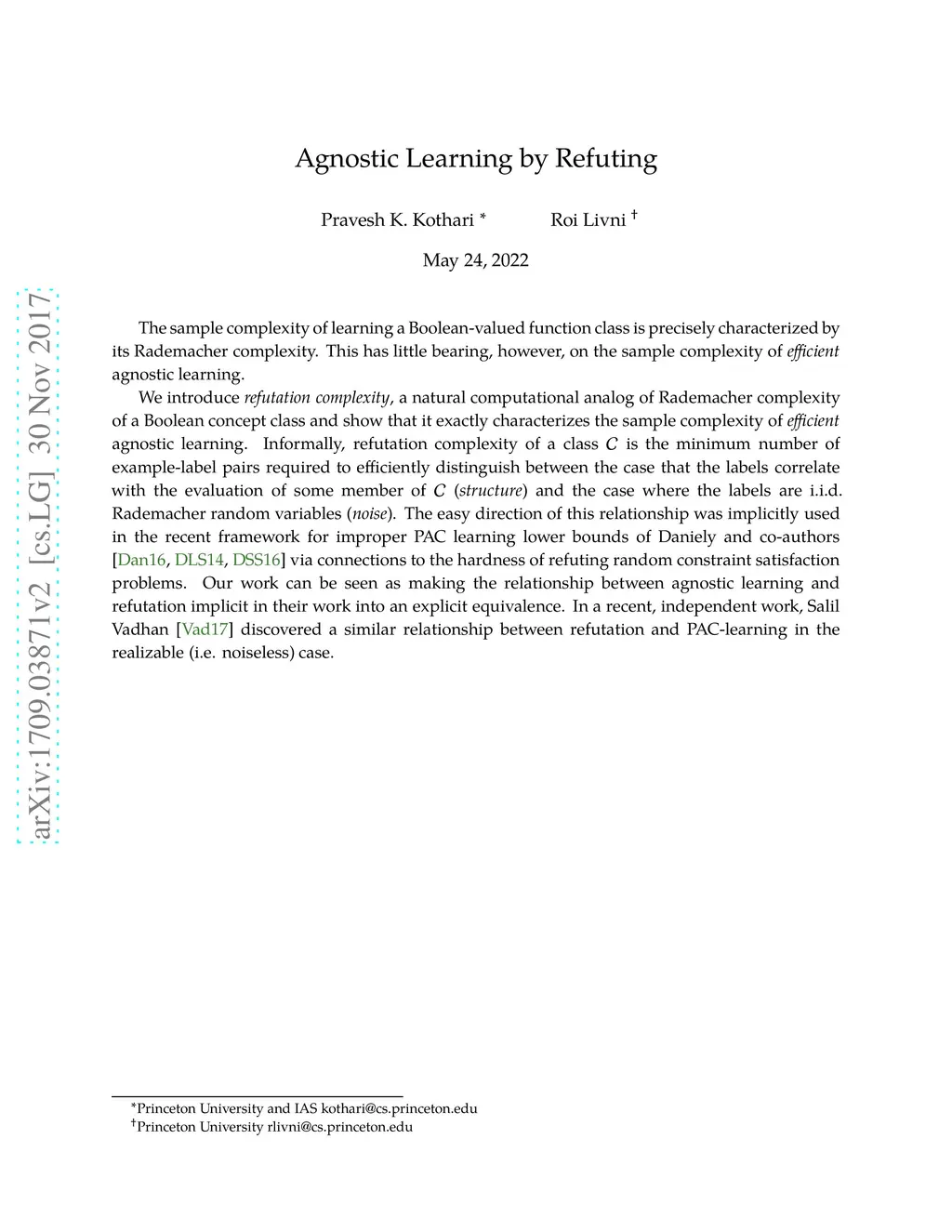 The sample complexity of learning a Boolean-valued function class is precisely characterized by its Rademacher complexity. This has little bearing, however, on the sample complexity of \emph{efficient} agnostic learning. We introduce \emph{refutation complexity}, a natural computational analog of Rademacher complexity of a Boolean concept class and show that it exactly characterizes the sample complexity of \emph{efficient} agnostic learning. Informally, refutation complexity of a class is the minimum number of example-label pairs required to efficiently distinguish between the case that the labels correlate with the evaluation of some member of (\emph{structure}) and the case where the labels are i.i.d. Rademacher random variables (\emph{noise}). The easy direction of this relationship was implicitly used in the recent framework for improper PAC learning lower bounds of Daniely and co-authors via connections to the hardness of refuting random constraint satisfaction problems. Our work can be seen as making the relationship between agnostic learning and refutation implicit in their work into an explicit equivalence. In a recent, independent work, Salil Vadhan discovered a similar relationship between refutation and PAC-learning in the realizable (i.e. noiseless) case.