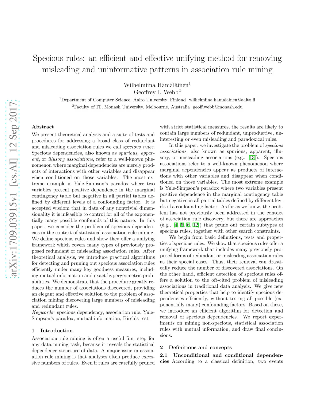 We present theoretical analysis and a suite of tests and procedures for addressing a broad class of redundant and misleading association rules we call \emph{specious rules}. Specious dependencies, also known as \emph{spurious}, \emph{apparent}, or \emph{illusory associations}, refer to a well-known phenomenon where marginal dependencies are merely products of interactions with other variables and disappear when conditioned on those variables. The most extreme example is Yule-Simpson's paradox where two variables present positive dependence in the marginal contingency table but negative in all partial tables defined by different levels of a confounding factor. It is accepted wisdom that in data of any nontrivial dimensionality it is infeasible to control for all of the exponentially many possible confounds of this nature. In this paper, we consider the problem of specious dependencies in the context of statistical association rule mining. We define specious rules and show they offer a unifying framework which covers many types of previously proposed redundant or misleading association rules. After theoretical analysis, we introduce practical algorithms for detecting and pruning out specious association rules efficiently under many key goodness measures, including mutual information and exact hypergeometric probabilities. We demonstrate that the procedure greatly reduces the number of associations discovered, providing an elegant and effective solution to the problem of association mining discovering large numbers of misleading and redundant rules.