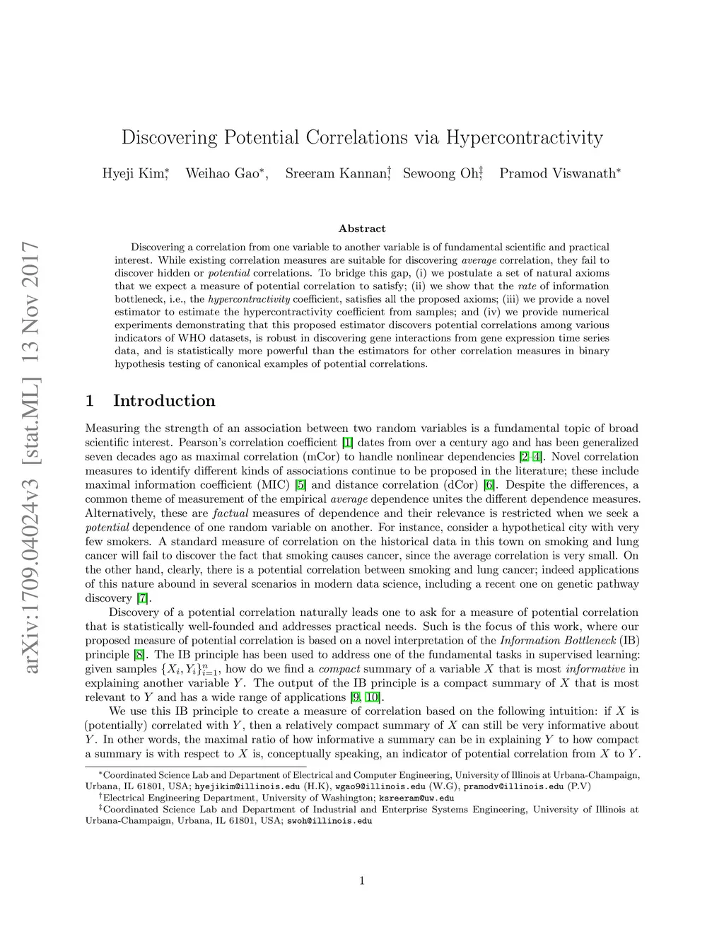 Discovering a correlation from one variable to another variable is of fundamental scientific and practical interest. While existing correlation measures are suitable for discovering average correlation, they fail to discover hidden or potential correlations. To bridge this gap, (i) we postulate a set of natural axioms that we expect a measure of potential correlation to satisfy; (ii) we show that the rate of information bottleneck, i.e., the hypercontractivity coefficient, satisfies all the proposed axioms; (iii) we provide a novel estimator to estimate the hypercontractivity coefficient from samples; and (iv) we provide numerical experiments demonstrating that this proposed estimator discovers potential correlations among various indicators of WHO datasets, is robust in discovering gene interactions from gene expression time series data, and is statistically more powerful than the estimators for other correlation measures in binary hypothesis testing of canonical examples of potential correlations.