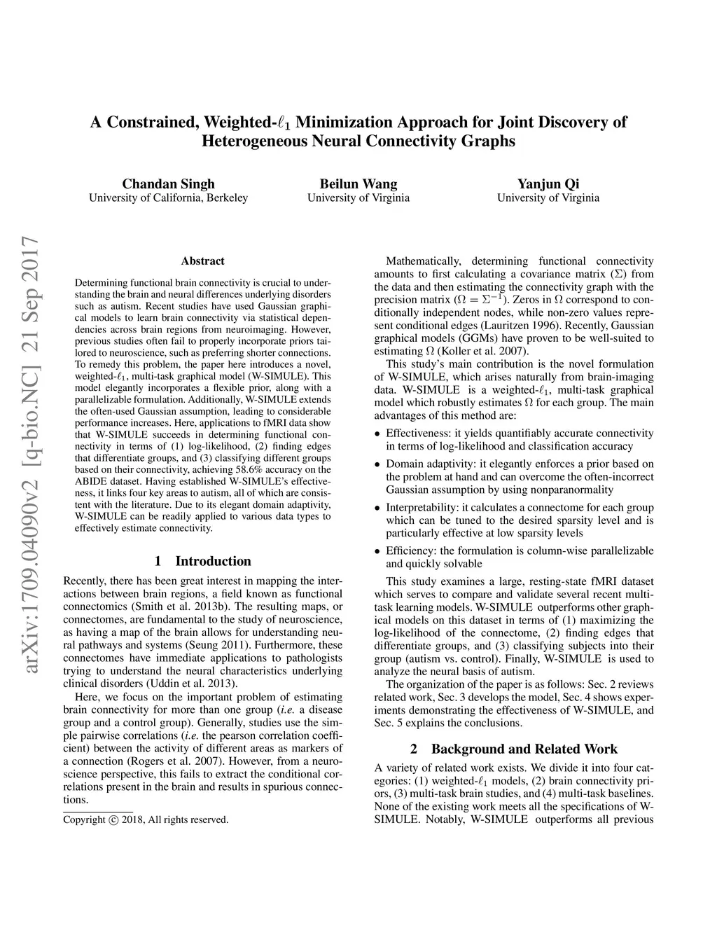 Determining functional brain connectivity is crucial to understanding the brain and neural differences underlying disorders such as autism. Recent studies have used Gaussian graphical models to learn brain connectivity via statistical dependencies across brain regions from neuroimaging. However, previous studies often fail to properly incorporate priors tailored to neuroscience, such as preferring shorter connections. To remedy this problem, the paper here introduces a novel, weighted-, multi-task graphical model (W-SIMULE). This model elegantly incorporates a flexible prior, along with a parallelizable formulation. Additionally, W-SIMULE extends the often-used Gaussian assumption, leading to considerable performance increases. Here, applications to fMRI data show that W-SIMULE succeeds in determining functional connectivity in terms of (1) log-likelihood, (2) finding edges that differentiate groups, and (3) classifying different groups based on their connectivity, achieving 58.6\% accuracy on the ABIDE dataset. Having established W-SIMULE's effectiveness, it links four key areas to autism, all of which are consistent with the literature. Due to its elegant domain adaptivity, W-SIMULE can be readily applied to various data types to effectively estimate connectivity.
