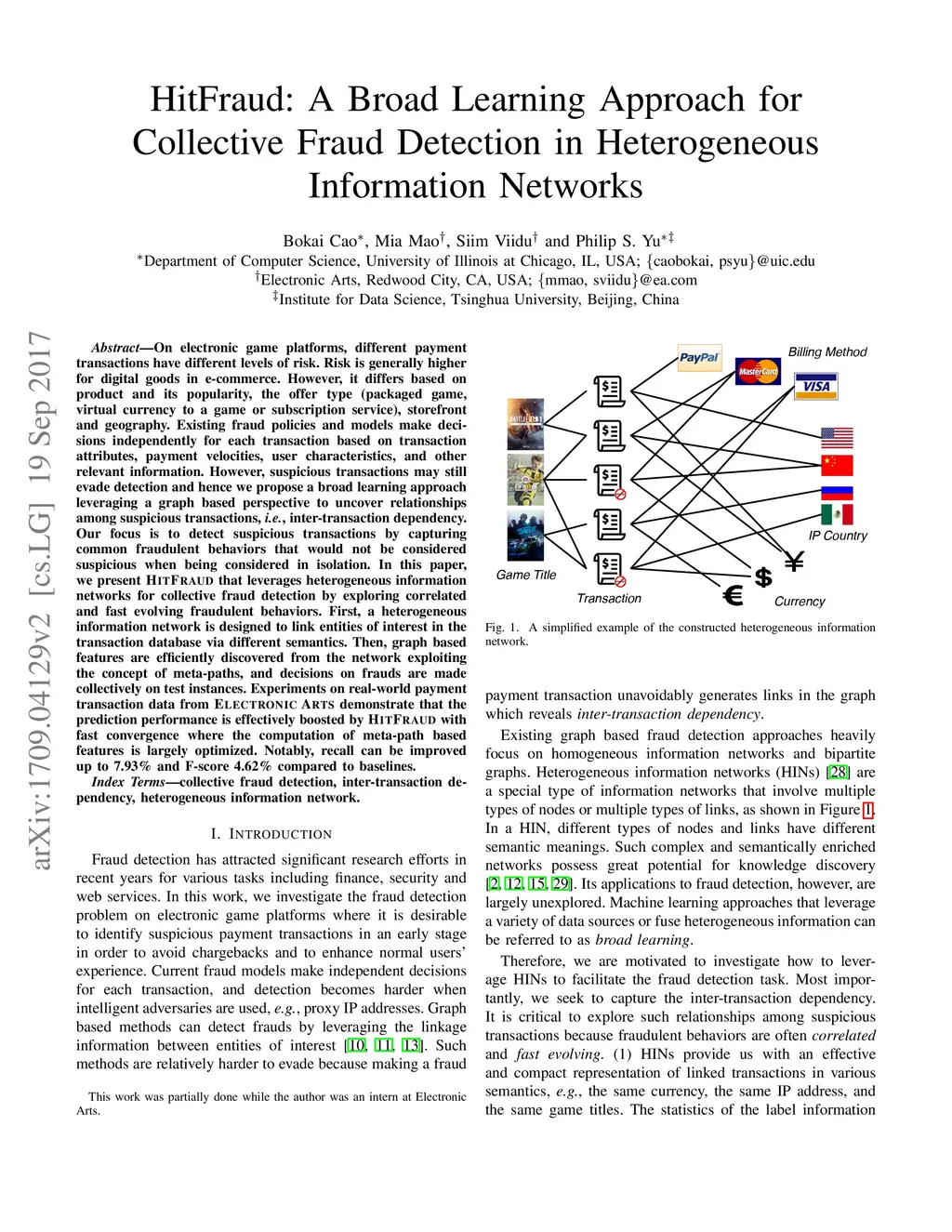 On electronic game platforms, different payment transactions have different levels of risk. Risk is generally higher for digital goods in e-commerce. However, it differs based on product and its popularity, the offer type (packaged game, virtual currency to a game or subscription service), storefront and geography. Existing fraud policies and models make decisions independently for each transaction based on transaction attributes, payment velocities, user characteristics, and other relevant information. However, suspicious transactions may still evade detection and hence we propose a broad learning approach leveraging a graph based perspective to uncover relationships among suspicious transactions, i.e., inter-transaction dependency. Our focus is to detect suspicious transactions by capturing common fraudulent behaviors that would not be considered suspicious when being considered in isolation. In this paper, we present HitFraud that leverages heterogeneous information networks for collective fraud detection by exploring correlated and fast evolving fraudulent behaviors. First, a heterogeneous information network is designed to link entities of interest in the transaction database via different semantics. Then, graph based features are efficiently discovered from the network exploiting the concept of meta-paths, and decisions on frauds are made collectively on test instances. Experiments on real-world payment transaction data from Electronic Arts demonstrate that the prediction performance is effectively boosted by HitFraud with fast convergence where the computation of meta-path based features is largely optimized. Notably, recall can be improved up to 7.93% and F-score 4.62% compared to baselines.