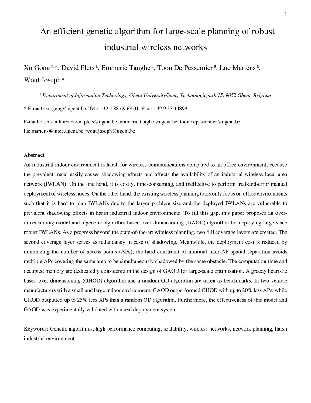 An industrial indoor environment is harsh for wireless communications compared to an office environment, because the prevalent metal easily causes shadowing effects and affects the availability of an industrial wireless local area network (IWLAN). On the one hand, it is costly, time-consuming, and ineffective to perform trial-and-error manual deployment of wireless nodes. On the other hand, the existing wireless planning tools only focus on office environments such that it is hard to plan IWLANs due to the larger problem size and the deployed IWLANs are vulnerable to prevalent shadowing effects in harsh industrial indoor environments. To fill this gap, this paper proposes an overdimensioning model and a genetic algorithm based over-dimensioning (GAOD) algorithm for deploying large-scale robust IWLANs. As a progress beyond the state-of-the-art wireless planning, two full coverage layers are created. The second coverage layer serves as redundancy in case of shadowing. Meanwhile, the deployment cost is reduced by minimizing the number of access points (APs); the hard constraint of minimal inter-AP spatial paration avoids multiple APs covering the same area to be simultaneously shadowed by the same obstacle. The computation time and occupied memory are dedicatedly considered in the design of GAOD for large-scale optimization. A greedy heuristic based over-dimensioning (GHOD) algorithm and a random OD algorithm are taken as benchmarks. In two vehicle manufacturers with a small and large indoor environment, GAOD outperformed GHOD with up to 20% less APs, while GHOD outputted up to 25% less APs than a random OD algorithm. Furthermore, the effectiveness of this model and GAOD was experimentally validated with a real deployment system.