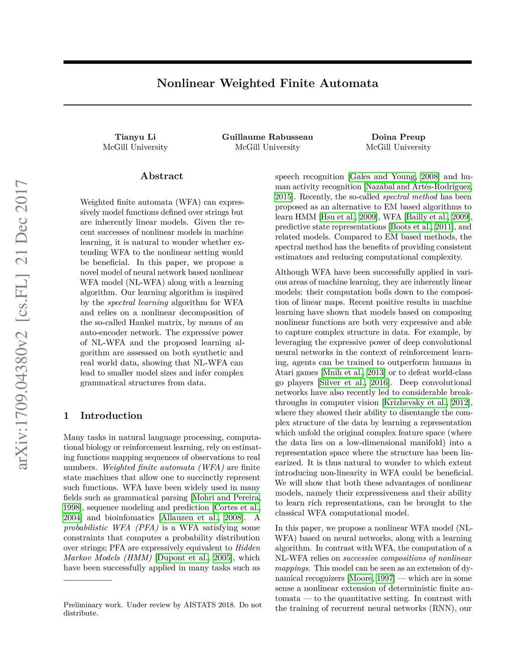 Weighted finite automata (WFA) can expressively model functions defined over strings but are inherently linear models. Given the recent successes of nonlinear models in machine learning, it is natural to wonder whether ex-tending WFA to the nonlinear setting would be beneficial. In this paper, we propose a novel model of neural network based nonlinearWFA model (NL-WFA) along with a learning algorithm. Our learning algorithm is inspired by the spectral learning algorithm for WFAand relies on a nonlinear decomposition of the so-called Hankel matrix, by means of an auto-encoder network. The expressive power of NL-WFA and the proposed learning algorithm are assessed on both synthetic and real-world data, showing that NL-WFA can lead to smaller model sizes and infer complex grammatical structures from data.