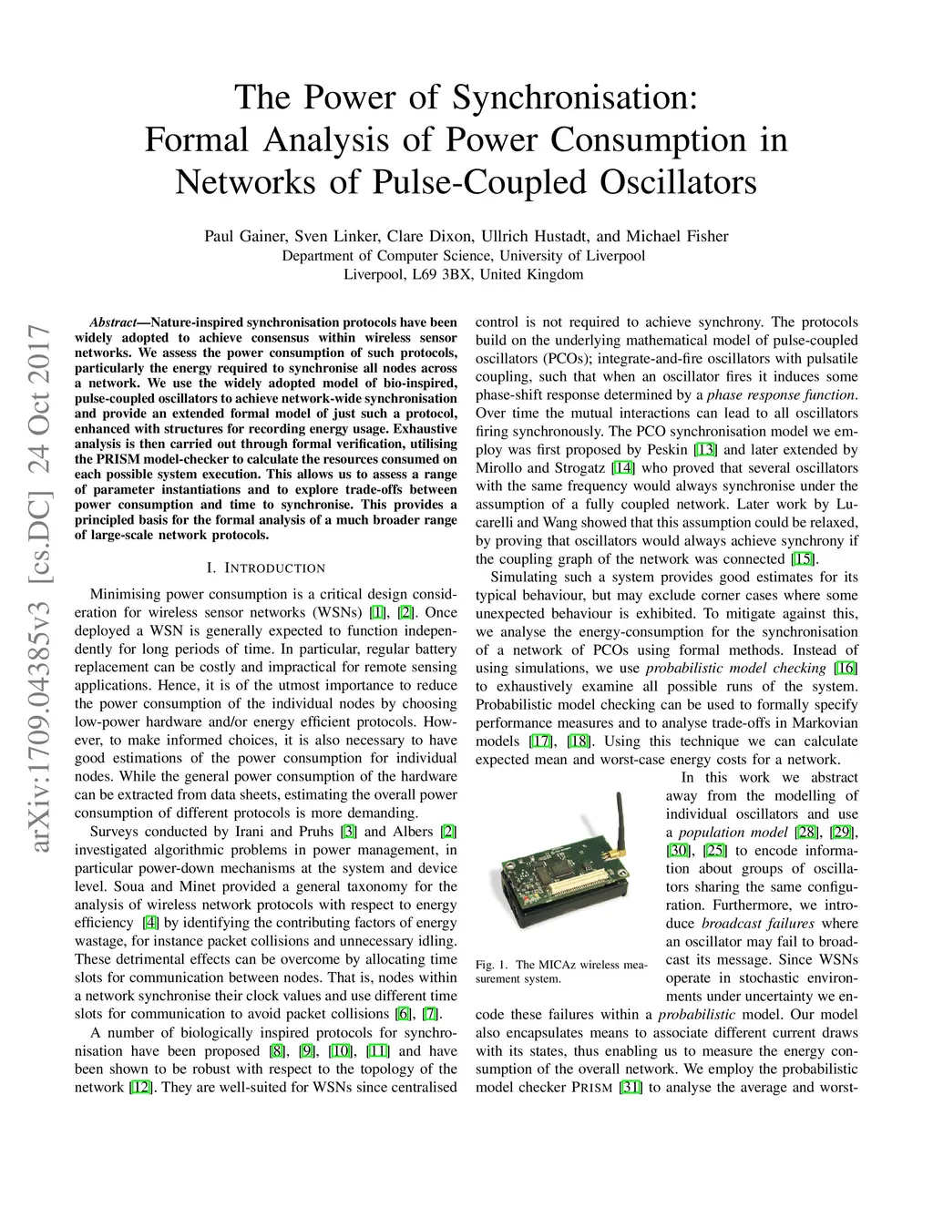 We assess the power consumption of network synchronisation protocols, particularly the energy required to synchronise all nodes across a network. We use the widely adopted approach of bio-inspired, pulse-coupled oscillators to achieve network-wide synchronisation and provide an extended formal model of just such a protocol, enhanced with structures for recording energy usage. Exhaustive analysis is then carried out through formal verification, utilising the PRISM model checker to calculate the resources consumed on each possible system execution. This allows us to assess a range of parameter instantiations and to explore trade-offs between power consumption and time to synchronise. This provides a principled basis for the formal analysis of a much broader range of large-scale network protocols.