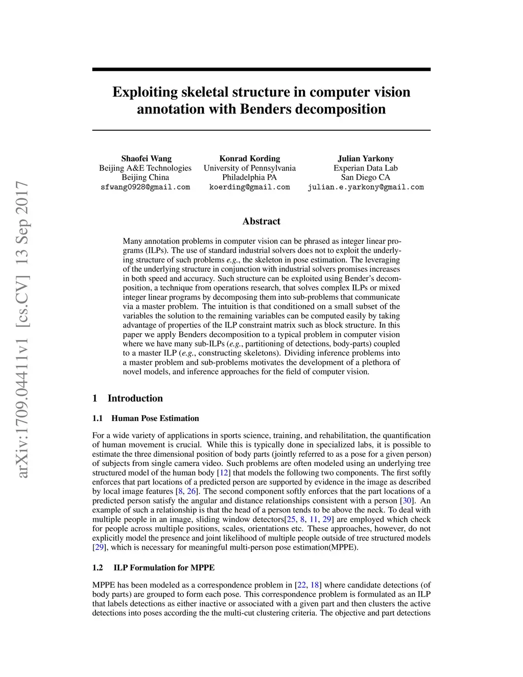 Many annotation problems in computer vision can be phrased as integer linear programs (ILPs). The use of standard industrial solvers does not to exploit the underlying structure of such problems eg, the skeleton in pose estimation. The leveraging of the underlying structure in conjunction with industrial solvers promises increases in both speed and accuracy. Such structure can be exploited using Bender's decomposition, a technique from operations research, that solves complex ILPs or mixed integer linear programs by decomposing them into sub-problems that communicate via a master problem. The intuition is that conditioned on a small subset of the variables the solution to the remaining variables can be computed easily by taking advantage of properties of the ILP constraint matrix such as block structure. In this paper we apply Benders decomposition to a typical problem in computer vision where we have many sub-ILPs (eg, partitioning of detections, body-parts) coupled to a master ILP (eg, constructing skeletons). Dividing inference problems into a master problem and sub-problems motivates the development of a plethora of novel models, and inference approaches for the field of computer vision.