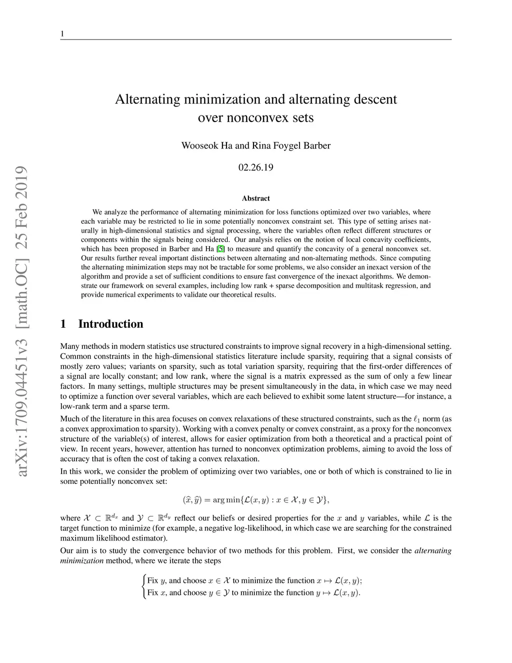 We analyze the performance of alternating minimization for loss functions optimized over two variables, where each variable may be restricted to lie in some potentially nonconvex constraint set. This type of setting arises naturally in high-dimensional statistics and signal processing, where the variables often reflect different structures or components within the signals being considered. Our analysis relies on the notion of local concavity coefficients, which has been proposed in Barber and Ha to measure and quantify the concavity of a general nonconvex set. Our results further reveal important distinctions between alternating and non-alternating methods. Since computing the alternating minimization steps may not be tractable for some problems, we also consider an inexact version of the algorithm and provide a set of sufficient conditions to ensure fast convergence of the inexact algorithms. We demonstrate our framework on several examples, including low rank + sparse decomposition and multitask regression, and provide numerical experiments to validate our theoretical results.