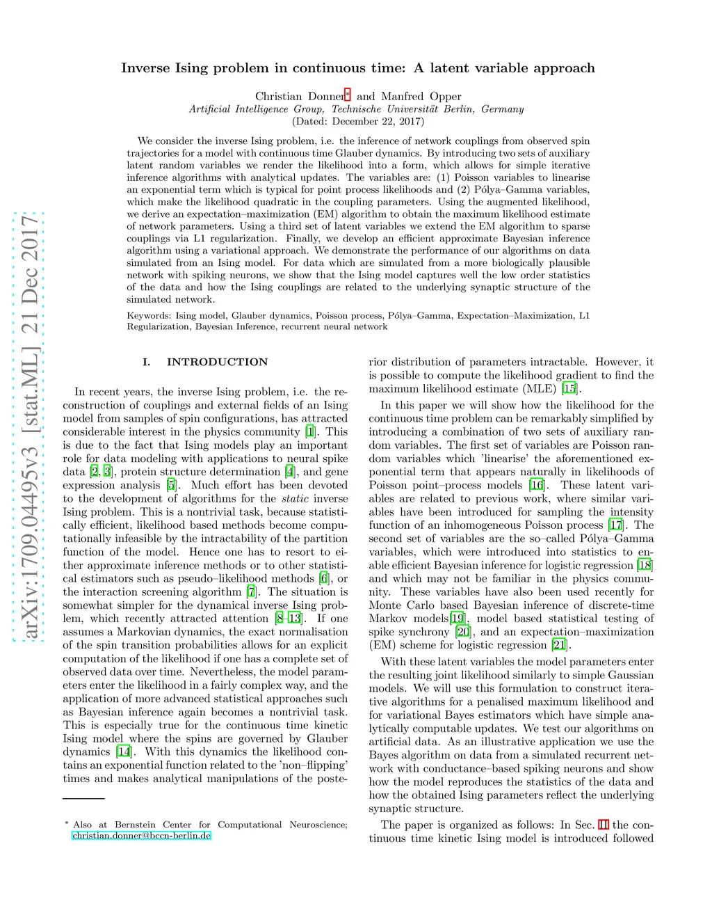 We consider the inverse Ising problem, i.e. the inference of network couplings from observed spin trajectories for a model with continuous time Glauber dynamics. By introducing two sets of auxiliary latent random variables we render the likelihood into a form, which allows for simple iterative inference algorithms with analytical updates. The variables are: (1) Poisson variables to linearise an exponential term which is typical for point process likelihoods and (2) P\ólya-Gamma variables, which make the likelihood quadratic in the coupling parameters. Using the augmented likelihood, we derive an expectation-maximization (EM) algorithm to obtain the maximum likelihood estimate of network parameters. Using a third set of latent variables we extend the EM algorithm to sparse couplings via L1 regularization. Finally, we develop an efficient approximate Bayesian inference algorithm using a variational approach. We demonstrate the performance of our algorithms on data simulated from an Ising model. For data which are simulated from a more biologically plausible network with spiking neurons, we show that the Ising model captures well the low order statistics of the data and how the Ising couplings are related to the underlying synaptic structure of the simulated network.