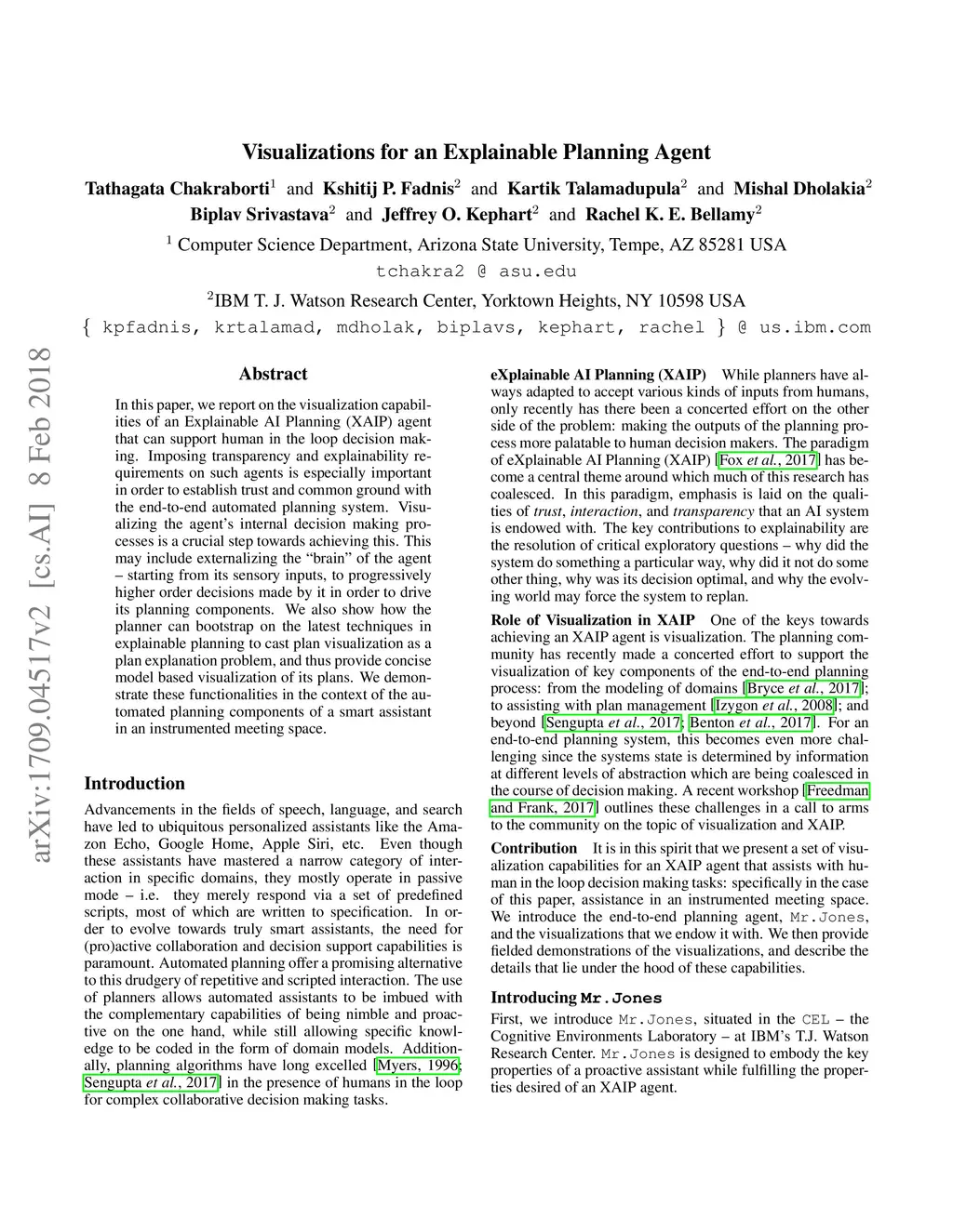 In this paper, we report on the visualization capabilities of an Explainable AI Planning (XAIP) agent that can support human in the loop decision making. Imposing transparency and explainability requirements on such agents is especially important in order to establish trust and common ground with the end-to-end automated planning system. Visualizing the agent's internal decision-making processes is a crucial step towards achieving this. This may include externalizing the "brain" of the agent -- starting from its sensory inputs, to progressively higher order decisions made by it in order to drive its planning components. We also show how the planner can bootstrap on the latest techniques in explainable planning to cast plan visualization as a plan explanation problem, and thus provide concise model-based visualization of its plans. We demonstrate these functionalities in the context of the automated planning components of a smart assistant in an instrumented meeting space.