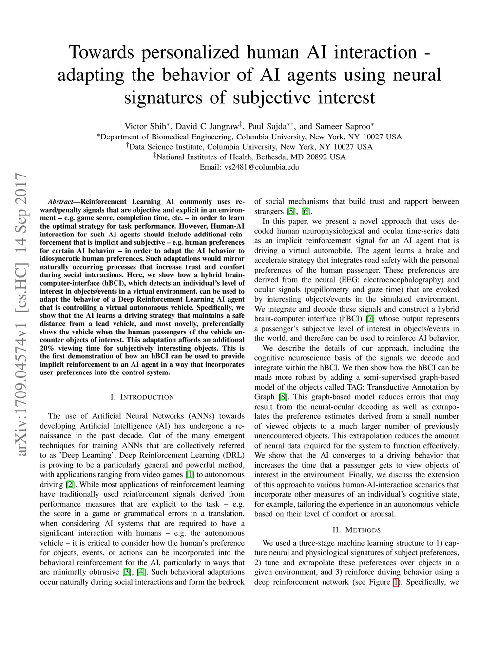 Reinforcement Learning AI commonly uses reward/penalty signals that are objective and explicit in an environment -- e.g. game score, completion time, etc. -- in order to learn the optimal strategy for task performance. However, Human-AI interaction for such AI agents should include additional reinforcement that is implicit and subjective -- e.g. human preferences for certain AI behavior -- in order to adapt the AI behavior to idiosyncratic human preferences. Such adaptations would mirror naturally occurring processes that increase trust and comfort during social interactions. Here, we show how a hybrid brain-computer-interface (hBCI), which detects an individual's level of interest in objects/events in a virtual environment, can be used to adapt the behavior of a Deep Reinforcement Learning AI agent that is controlling a virtual autonomous vehicle. Specifically, we show that the AI learns a driving strategy that maintains a safe distance from a lead vehicle, and most novelly, preferentially slows the vehicle when the human passengers of the vehicle encounter objects of interest. This adaptation affords an additional 20\% viewing time for subjectively interesting objects. This is the first demonstration of how an hBCI can be used to provide implicit reinforcement to an AI agent in a way that incorporates user preferences into the control system.