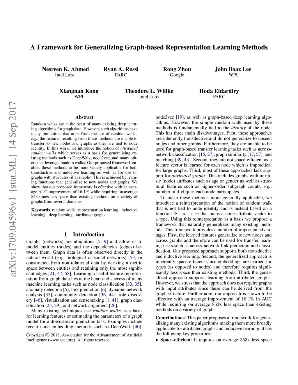 Random walks are at the heart of many existing deep learning algorithms for graph data. However, such algorithms have many limitations that arise from the use of random walks, e.g., the features resulting from these methods are unable to transfer to new nodes and graphs as they are tied to node identity. In this work, we introduce the notion of attributed random walks which serves as a basis for generalizing existing methods such as DeepWalk, node2vec, and many others that leverage random walks. Our proposed framework enables these methods to be more widely applicable for both transductive and inductive learning as well as for use on graphs with attributes (if available). This is achieved by learning functions that generalize to new nodes and graphs. We show that our proposed framework is effective with an average AUC improvement of 16.1% while requiring on average 853 times less space than existing methods on a variety of graphs from several domains.