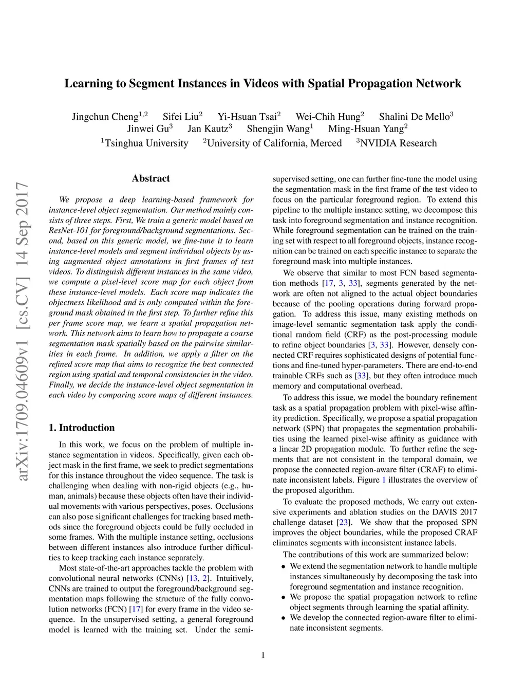 We propose a deep learning-based framework for instance-level object segmentation. Our method mainly consists of three steps. First, We train a generic model based on ResNet-101 for foreground/background segmentations. Second, based on this generic model, we fine-tune it to learn instance-level models and segment individual objects by using augmented object annotations in first frames of test videos. To distinguish different instances in the same video, we compute a pixel-level score map for each object from these instance-level models. Each score map indicates the objectness likelihood and is only computed within the foreground mask obtained in the first step. To further refine this per frame score map, we learn a spatial propagation network. This network aims to learn how to propagate a coarse segmentation mask spatially based on the pairwise similarities in each frame. In addition, we apply a filter on the refined score map that aims to recognize the best connected region using spatial and temporal consistencies in the video. Finally, we decide the instance-level object segmentation in each video by comparing score maps of different instances.
