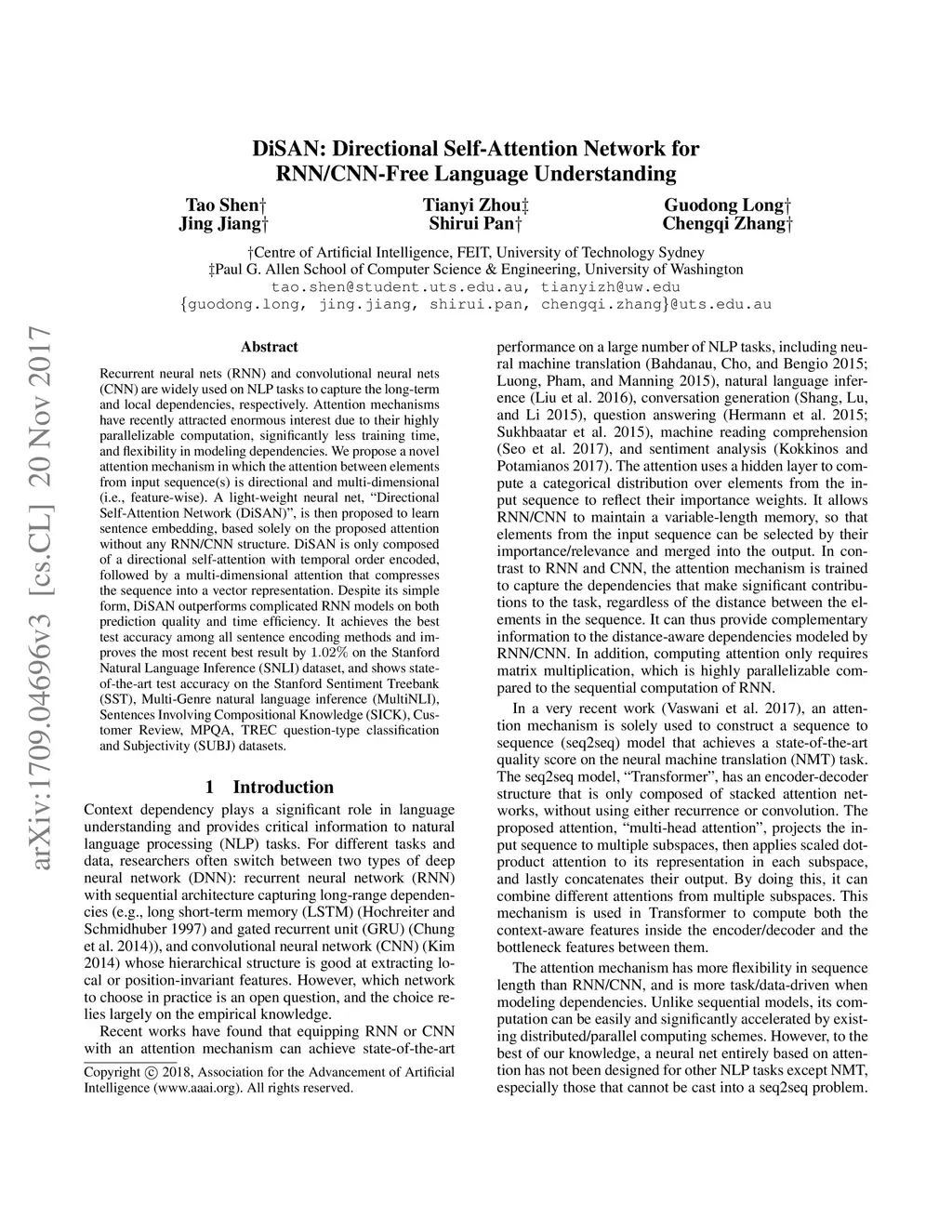 DiSAN: Directional Self-Attention Network for RNN/CNN-Free Language