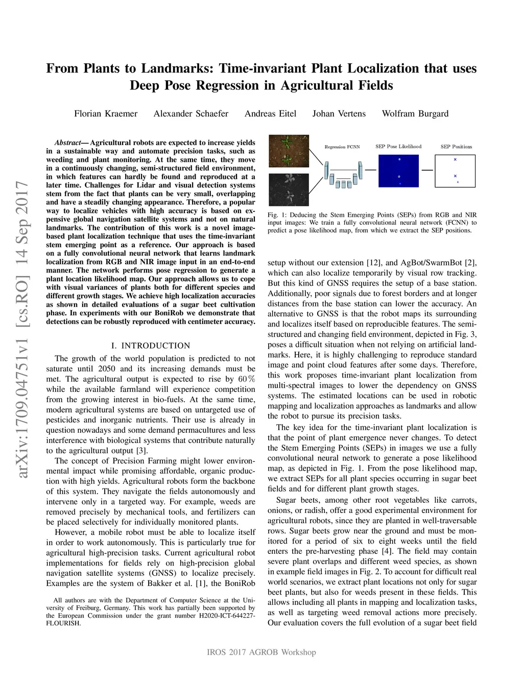 Agricultural robots are expected to increase yields in a sustainable way and automate precision tasks, such as weeding and plant monitoring. At the same time, they move in a continuously changing, semi-structured field environment, in which features can hardly be found and reproduced at a later time. Challenges for Lidar and visual detection systems stem from the fact that plants can be very small, overlapping and have a steadily changing appearance. Therefore, a popular way to localize vehicles with high accuracy is based on ex- pensive global navigation satellite systems and not on natural landmarks. The contribution of this work is a novel image- based plant localization technique that uses the time-invariant stem emerging point as a reference. Our approach is based on a fully convolutional neural network that learns landmark localization from RGB and NIR image input in an end-to-end manner. The network performs pose regression to generate a plant location likelihood map. Our approach allows us to cope with visual variances of plants both for different species and different growth stages. We achieve high localization accuracies as shown in detailed evaluations of a sugar beet cultivation phase. In experiments with our BoniRob we demonstrate that detections can be robustly reproduced with centimeter accuracy.