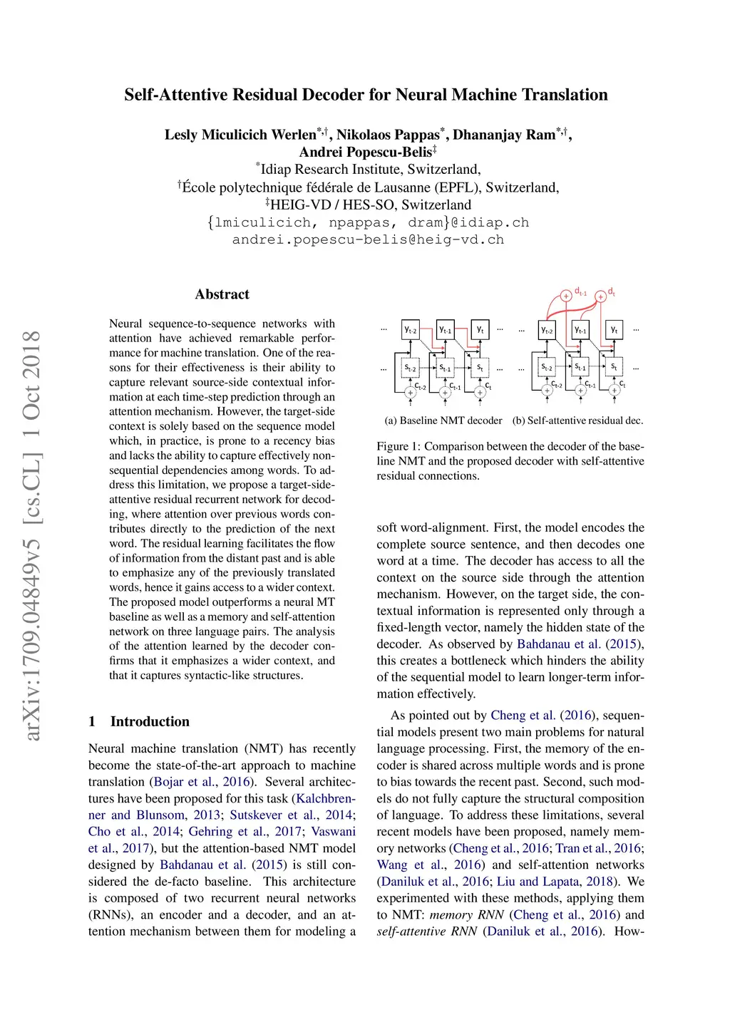 Self-Attentive Residual Decoder for Neural Machine Translation
