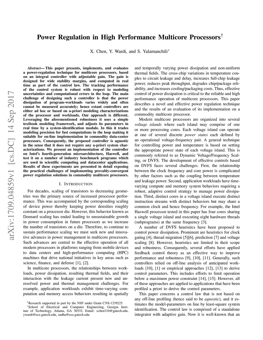 This paper presents, implements, and evaluates a power-regulation technique for multicore processors, based on an integral controller with adjustable gain. The gain is designed for wide stability margins, and computed in real time as part of the control law. The tracking performance of the control system is robust with respect to modeling uncertainties and computational errors in the loop. The main challenge of designing such a controller is that the power dissipation of program-workloads varies widely and often cannot be measured accurately; hence extant controllers are either ad hoc or based on a-priori modeling characterizations of the processor and workloads. Our approach is different. Leveraging the aforementioned robustness it uses a simple textbook modeling framework, and adjusts its parameters in real time by a system-identification module. In this it trades modeling precision for fast computations in the loop making it suitable for on-line implementation in commodity data-center processors. Consequently, the proposed controller is agnostic in the sense that it does not require any a-priori system characterizations. We present an implementation of the controller on Intel's fourth-generation microarchitecture, Haswell, and test it on a number of industry benchmark programs which are used in scientific computing and datacenter applications. Results of these experiments are presented in detail exposing the practical challenges of implementing provably-convergent power regulation solutions in commodity multicore processors.